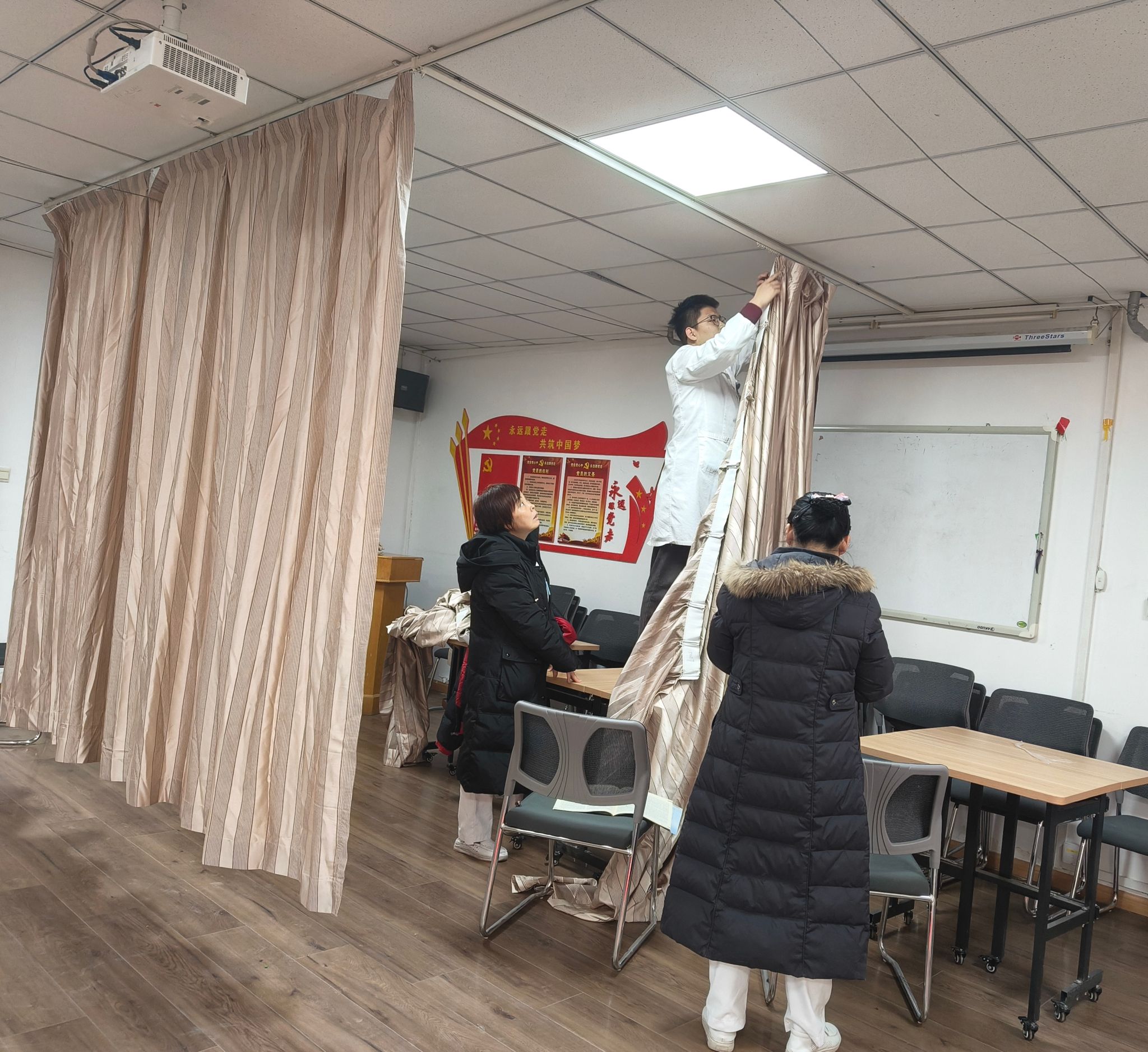 新年伊始,健康医学科马茂主任精心策划并确立了“简化流程、保障安全、精准服务”的服务原则,并指派科室护理团队负责具体实施并执行。2月13日与公卫中心、离退休办公室的老师共同对接场地需求,实地考察老年活动中心,搭建起临时体检站点,并精心布置隐私隔断,配置便携式心电图机、超声仪等先进体检设备,确保体检环境温馨、流程高效且安全。