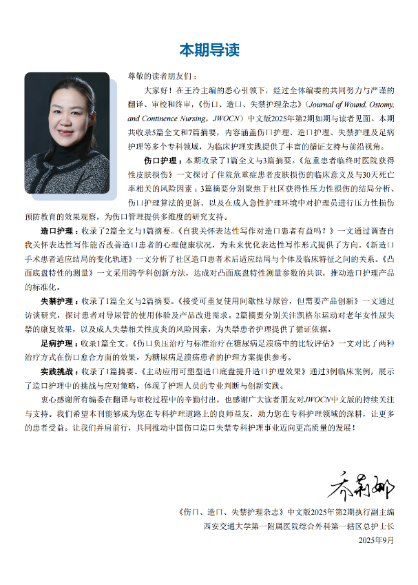 我院普通外科乔莉娜主任护师担任《伤口、造口、失禁护理杂志》(Journal of Wound, Ostomy, and Continence Nursing, JWOCN)中文版2025年第2期执行副主编,本期共收录5篇全文(伤口护理1篇,造口护理2篇,失禁护理1篇,足病护理1篇)和7篇摘要(伤口护理3篇,造口护理1篇,失禁护理2篇,实践挑战1篇)。这不仅是对我院伤口造口失禁领域贡献的充分肯定,也标志着我院在国内外专科护理学术舞台上的地位。