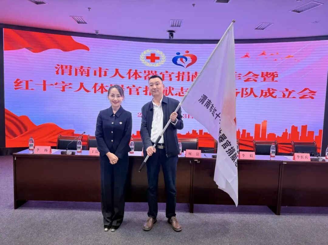 随后,何洁为渭南市红十字人体器官捐献志愿服务队授旗。