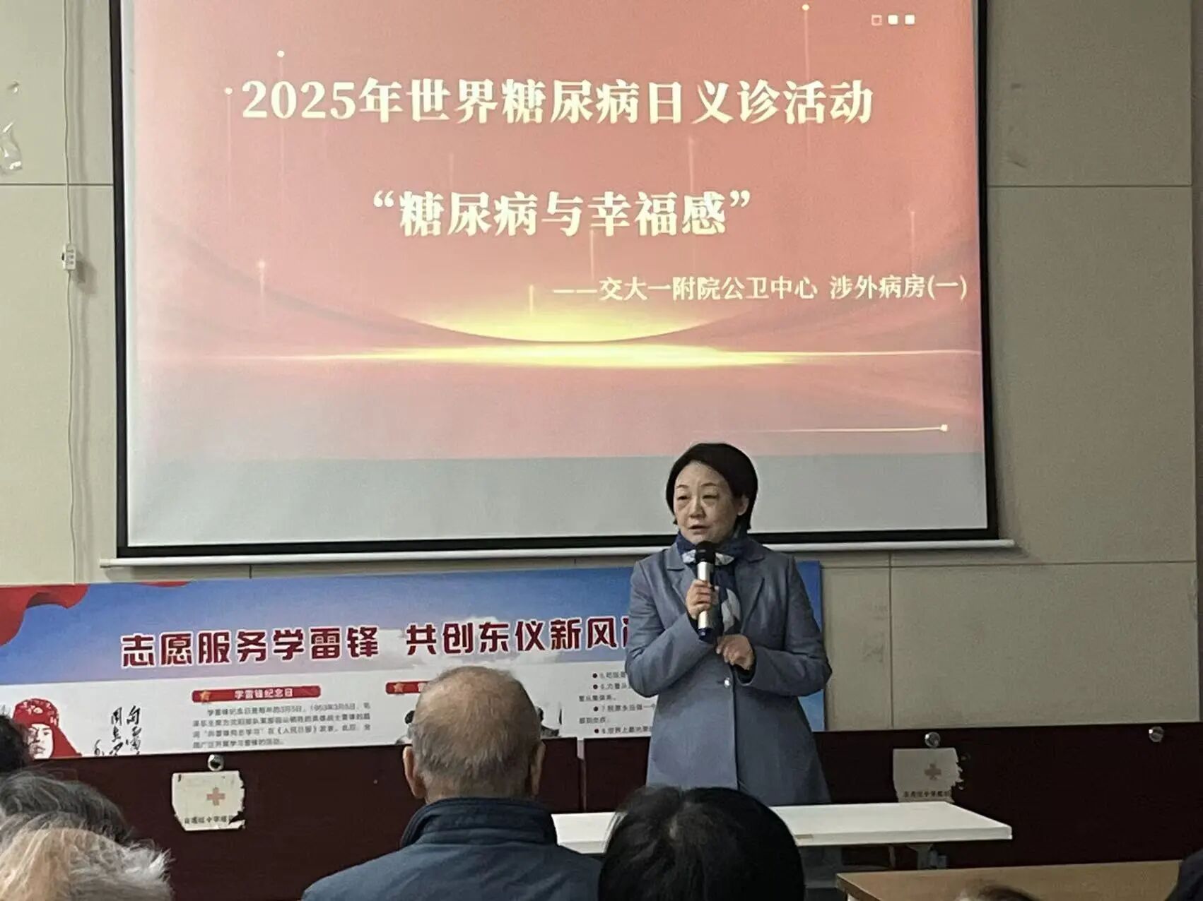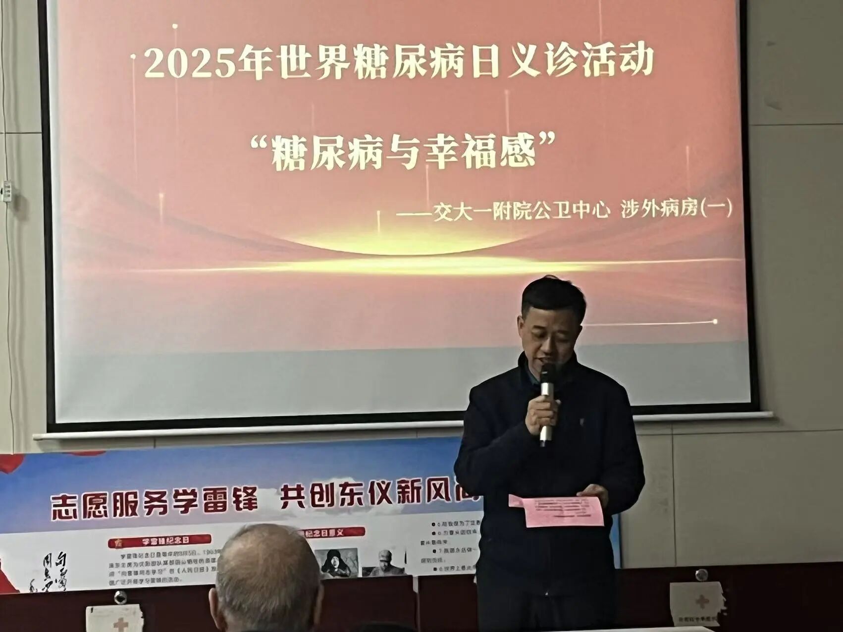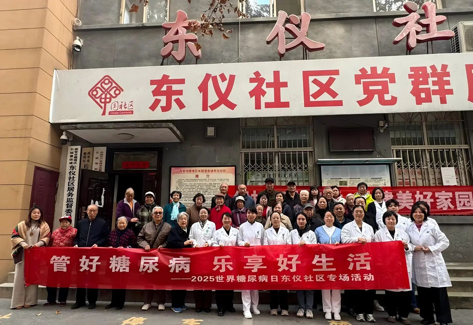 2025年11月14日上午,在第19个“世界糖尿病日”(又称“联合国糖尿病日”)到来之际,由东仪工会与西安交通大学第一附属医院联合主办的“管好糖尿病,乐享好生活”主题健康活动在东仪社区党群服务中心成功举行。本次活动紧扣“糖尿病与幸福感”的年度主题,由我院公共卫生中心牵头组织,联合涉外病房(一)老年内分泌代谢科、周围血管科、眼科、肾内科等多个科室共同参与,通过“专家讲座+多学科义诊”的形式,为社区居民提供了专业、贴心的健康服务。