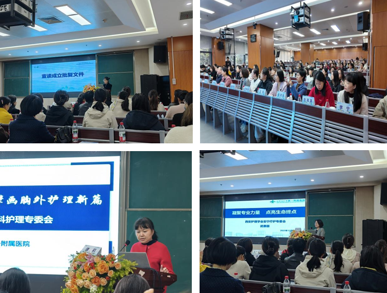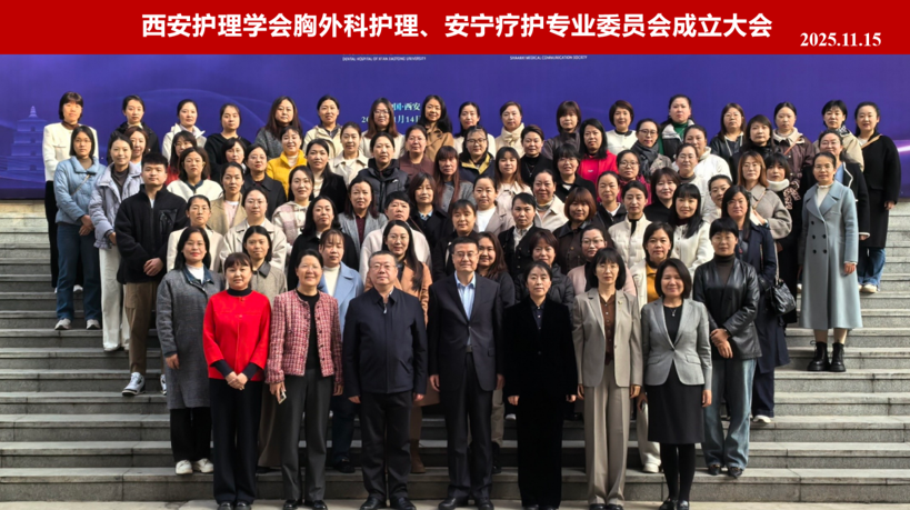 2025年11月15日上午9时,西安护理学会胸外科护理及安宁疗护护理专业委员会成立大会在西安隆重召开。西安市卫健委学会服务中心郝剑主任、西安护理学会张巧玲理事长、西安交通大学第一附属医院党委冯广林副书记、护理部李洁琼主任、西安护理学会马莉娜秘书长等嘉宾莅临会议。此外,西安护理学会胸外科护理及安宁疗护护理专业委员会全体成员等100余人也参与了此次盛会。