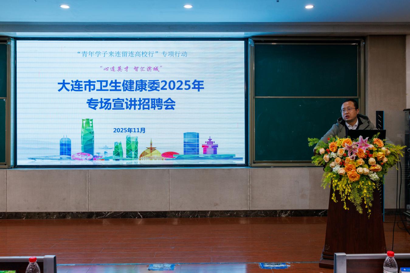 为广泛拓展就业渠道,搭建用人单位与医学生之间更加直接高效的沟通联络平台,在交大学生就业创业指导服务中心和医学部指导下,11月19日晚,大连市卫生健康委“心连英才 智汇滨城”专场招聘宣讲活动在我院科教楼0101教室顺利举行。大连市卫生健康委党组成员、副主任王剑飞,人事处处长李光盈,大连市卫生健康事业发展中心党委书记、主任林君,西安交通大学医学部党委副书记陈晨,我院党委副书记、纪委书记梁志静,院学生工作办公室主任王蜜蜜,大连理工大学附属中心医院(大连市中心医院)、大连市第三人民医院、大连市妇女儿童医疗中心(集团)等10余家大连市市属优质医疗卫生机构负责人员,在读研究生等近百人参加相关活动。