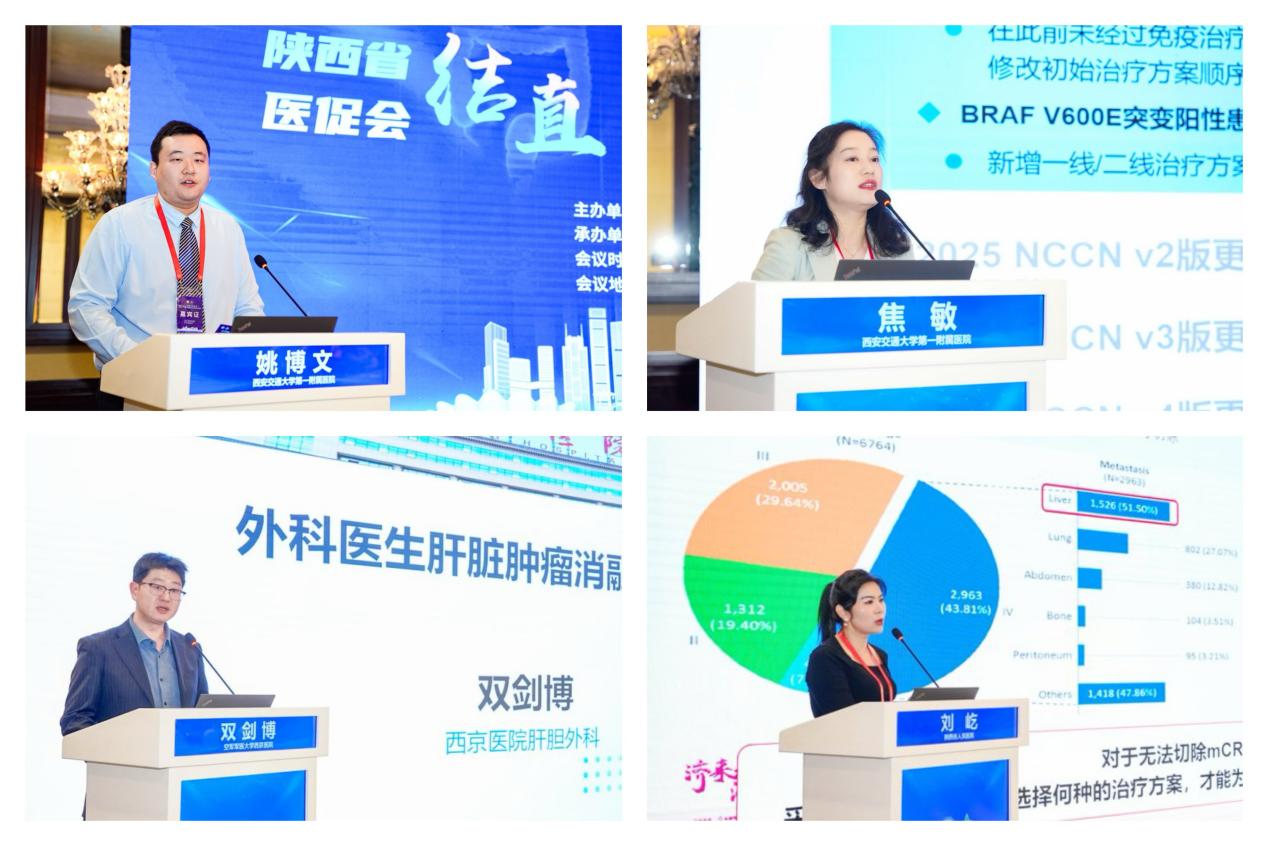 在紧随其后的学术会议环节,多位顶尖专家带来了精彩纷呈的主题报告。复旦大学附属肿瘤医院潘奇教授、陆军军医大学西南医院王小军教授、华中科技大学同济医学院附属同济医院张斌豪教授,西安交通大学第一附属医院焦敏教授、韩少山教授、陕西省人民医院刘屹教授等学者分别围绕“肠癌肝转移PSH理念在MIS中的应用”、“2025NCCN结肠癌指南更新解读”、“肠癌肝转移的手术切除联合射频消融的治疗”等前沿热点议题进行了深度分享,内容涵盖外科手术、消融治疗、转化治疗及内科方案选择等多个维度,展现了该领域的最新进展与未来方向。空军军医大学西京医院双剑博教授则就“外科医生肝脏肿瘤消融学习曲线”这一实用课题进行了阐述。上午的会议在宋涛教授的总结中告一段落。