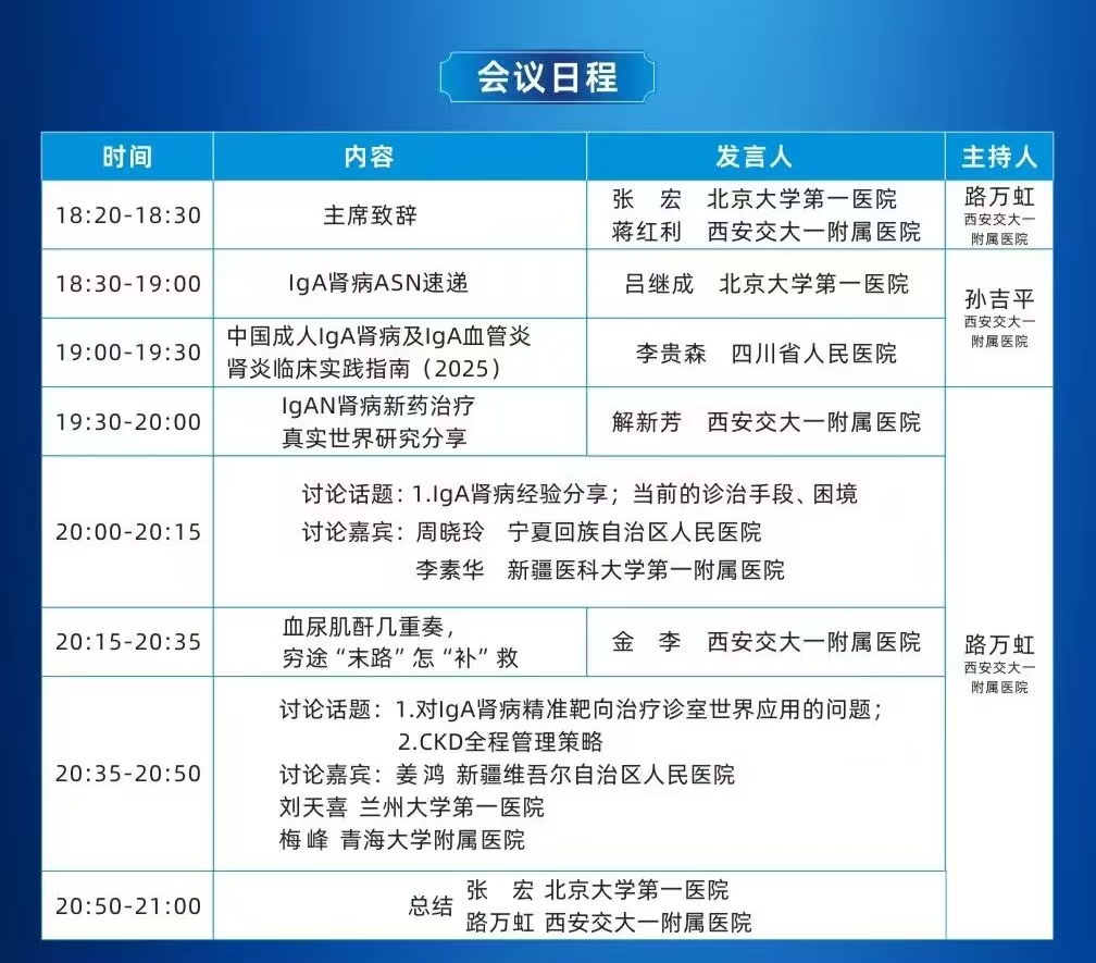 会议于18:30准时拉开帷幕,西安交大一附院肾脏内科路万虹主任主持,在简短的开幕致辞中,大会主席、来自北京大学第一医院的张宏教授与西安交大一附院的蒋红利教授共同展望了本次会议的目标,他们强调,IgA肾病作为我国最常见的原发性肾小球疾病,其诊治水平的提升关乎广大患者的生命健康,希望通过此次高水平的学术交流,能够推动西北乃至全国肾科医师诊疗能力的共同进步,为患者带来更优的诊疗方案。
