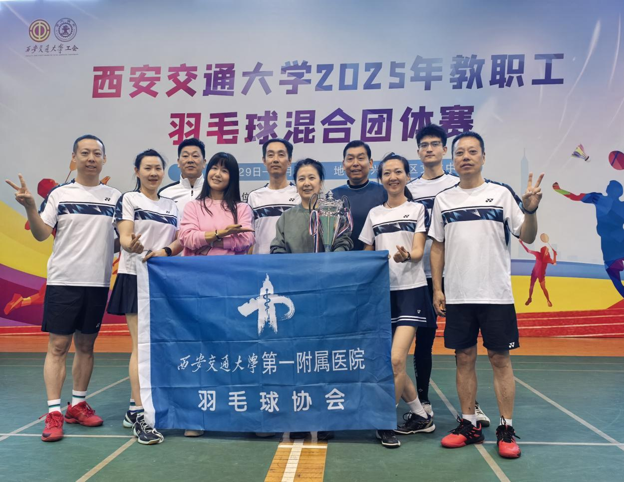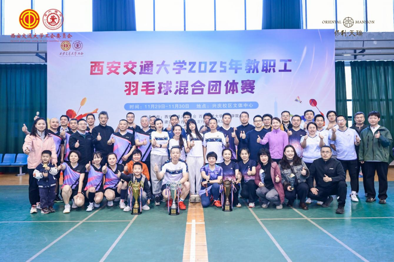 2025年11月29日至30日,西安交通大学2025年教职工羽毛球混合团体赛在兴庆校区文体中心火热开赛。来自全校各单位的8组28支精英队伍齐聚一堂,以球会友、切磋技艺。在这场充满激情与挑战的赛事中,我院两支代表队凭借顽强的斗志与精湛的球技双双以小组第一的成绩脱颖而出挺进复赛,其中一队一路过关斩将闯入决赛,最终斩获亚军,充分展现了交大一附院人“永不言弃、追求卓越”的精神风貌。