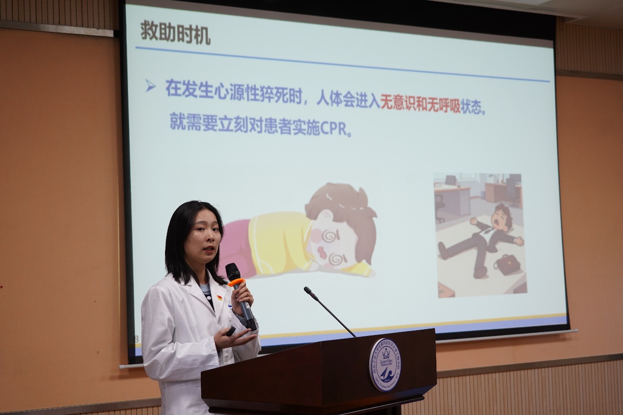 在急救技能培训环节,宣讲团成员、神经外科硕士研究生周明静以《心肺复苏(CPR)——关键时刻的生命守护》为题,结合《2025 AHA心肺复苏及心血管急救指南》最新标准,系统讲解了心脏骤停识别、胸外按压规范、人工呼吸配合及AED操作流程。宣讲团成员现场进行了标准流程演示,详细示范了按压部位定位、手势姿势、力度频率等关键要点。