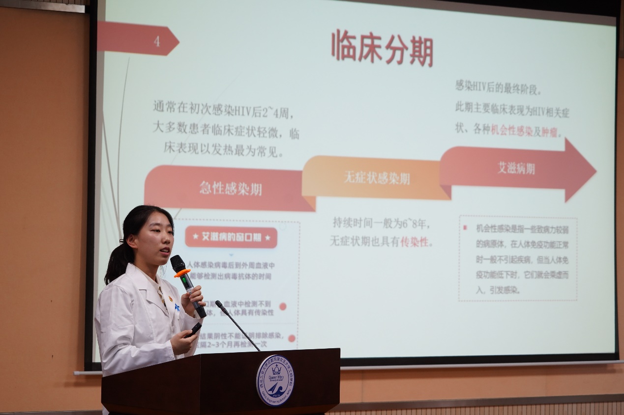 我院“青医之声”学生宣讲团成员、肝胆外科宋轶群博士以《“艾”的防御战》为题,介绍了HIV与AIDS基本概念,讲解了临床分期与传播途径等内容,通过“三问判断感染风险”实用方法与高危后阻断药使用原则等专业介绍向在场的师生普及了艾滋病防护知识,用今年“世界艾滋病日”的宣传主题“社会共治,守正创新,终结艾滋”引导师生建立科学防护意识。