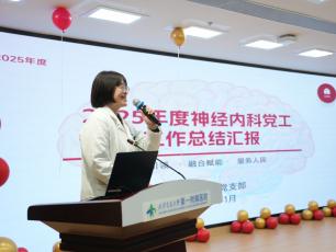 在工作汇报环节,罗国刚主任系统回顾了神经内科2025年度整体工作,围绕“一院三区”协调发展、亚专科建设、医疗质量与安全、教学成果、科研成绩等方面展开总结,并明确了2026年的发展目标与实施路径。曹红梅书记就党支部建设、工会工作与科室文化作了专题汇报,强调党建引领在凝聚队伍、推动发展中的重要作用。杨剑波副主任则聚焦东院区运营情况,总结成绩、分析挑战,并提出新一年的优化举措。