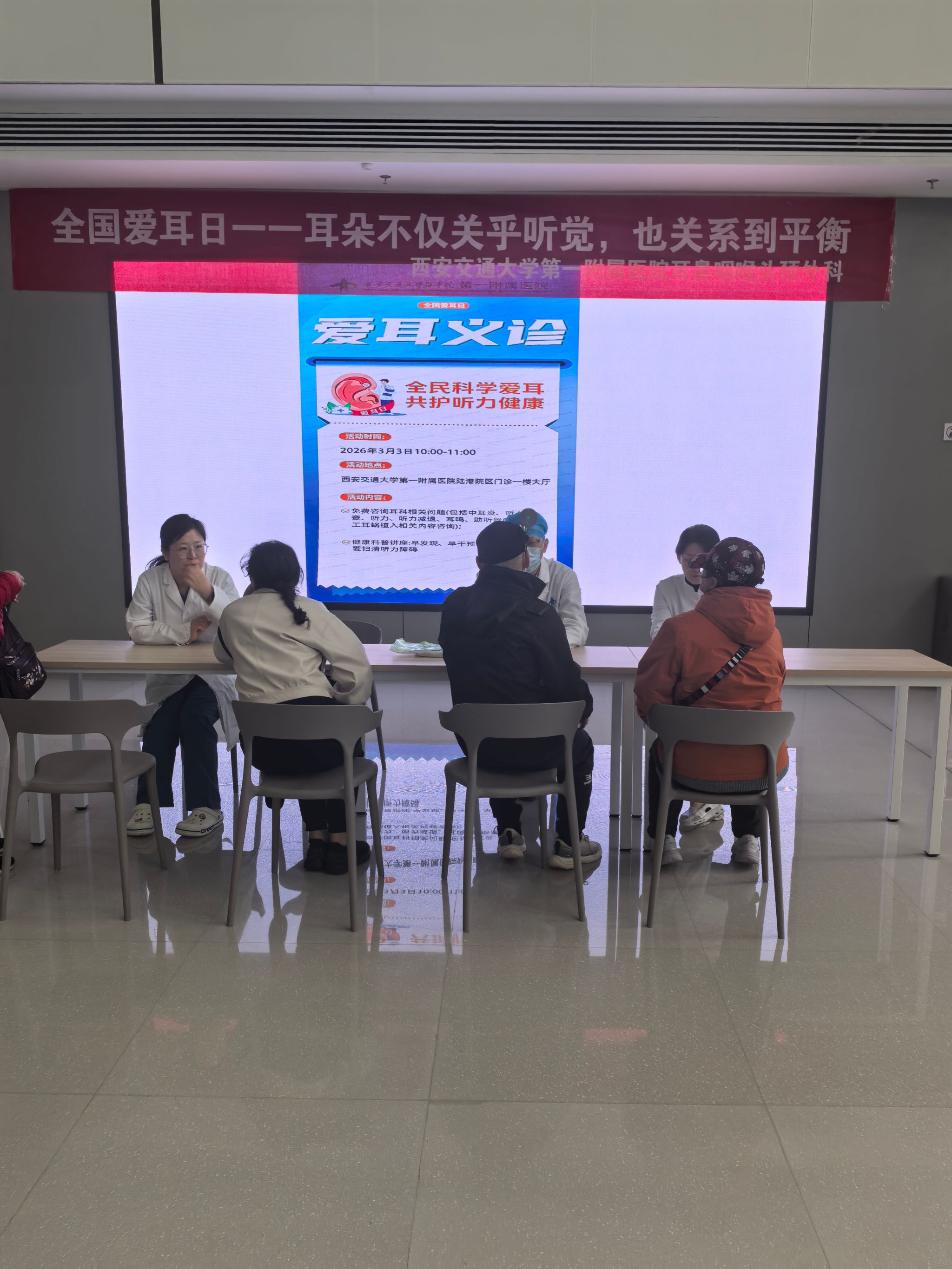 2026年3月3日是第27个全国爱耳日,今年的主题为“全民科学爱耳,共护听力健康”。为提升公众对耳部健康的重视,普及科学护耳知识,西安交通大学第一附属医院耳鼻喉头颈外科陆港院区团队,在门诊一楼大厅开展了一场别开生面的爱耳日义诊活动。