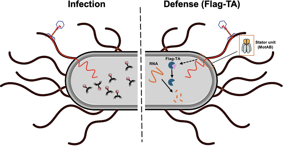 面对噬菌体的猛烈攻击,细菌也并非被动受害。团队发现,部分耶尔森菌株进化出了一套精妙的“自杀式”防御系统——依赖鞭毛的毒素-抗毒素系统。当细菌通过鞭毛感知到噬菌体X1的入侵后,信号通过鞭毛马达关键蛋白MotAB传导,进而激活该防御系统。被感染的细胞将启动“流产感染”机制,通过自我牺牲来阻断噬菌体的复制与扩散,从而保护整个细菌群体,这是一种典型的利他性群体生存策略。