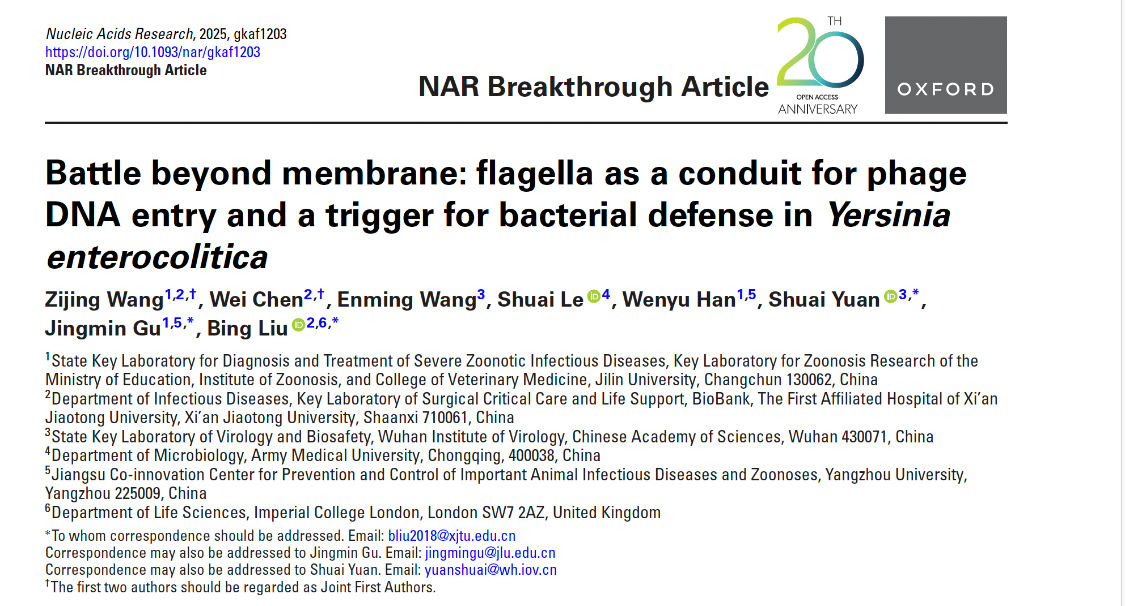 近日, 我院刘冰教授联合吉林大学顾敬敏教授、中国科学院武汉病毒研究所袁帅教授 团队 开展科技攻关, 在国际核酸研究领域顶级期刊《Nucleic Acids Research》以突破性论文(Breakthrough Article)形式发表 题为《 Battle beyond membrane: flagella as a conduit for phage DNA entry and a trigger for bacterial defense in Yersinia enterocolitica 》的 研究 论文。该研究 首次系统揭示了细菌鞭毛在噬菌体感染过程中的 “ 双重角色 ” :它不仅作为噬菌体入侵宿主细胞的 “ 病毒入口 ” ,还能充当细菌感知病毒攻击并启动免疫防御的 “ 关键警报器 ” 。这一发现深刻刷新了人们对噬菌体-细菌相互作用复杂性的认知,为未来噬菌体疗法的优化设计与新型抗感染策略的开发提供了重要的理论依据。