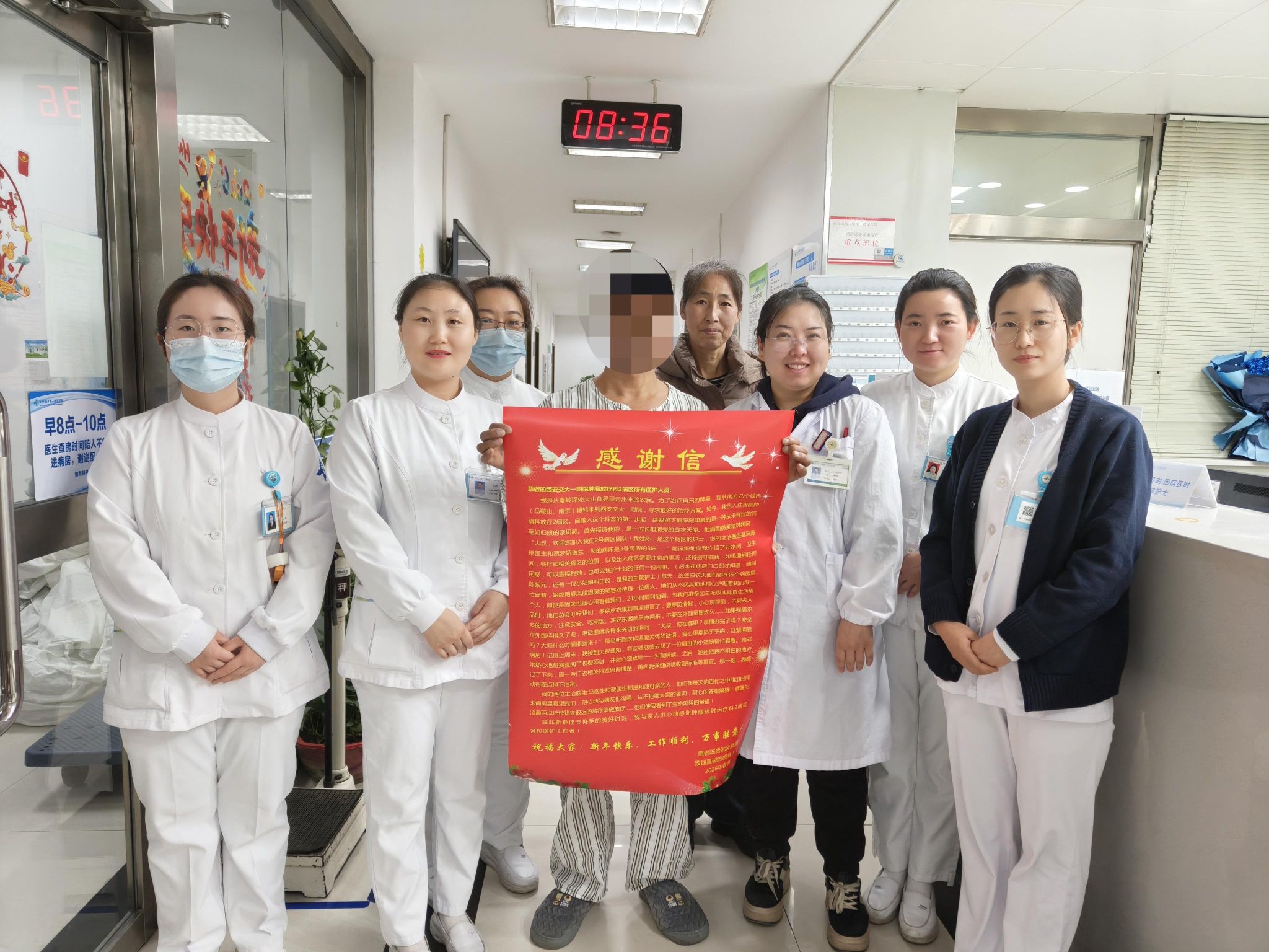 信任是医患关系中最宝贵的财富,医学从来不是冰冷的,他是有温度的,医疗不仅是医病,更是要为患者带去希望和鼓励。这封感谢信既是对全体医护人员工作的肯定与支持,更是激励着全院职工在守护人民健康的道路上,更加坚定前行的动力。未来,西安交通大学第一附属医院肿瘤放疗科全体医护人员将继续用专业的医术、高尚的医德和无私的爱心,让医疗服务更有温度,更有力量。值此新年来临之际,肿瘤放疗科全体医护人员祝大家新年快乐!身体健康!万事如意!
