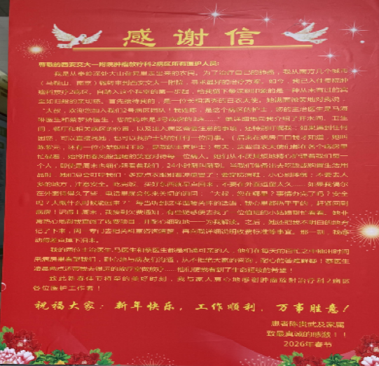 农历腊月二十六,当大家沉浸在迎接新春的喜悦中时,肿瘤放疗科2病区收到了一份特殊的新年礼物,科室患者陈先生和家属为医生和护士送上了一封感谢信。这不仅仅是一封信,而是一束光,照亮了护患之间最理想、最温暖的模样。我们深知,信中的每一个字,都源于他在治疗期间最真实的感受。那些被他记住的姓名、细节和暖心的话语,对我们而言是莫大的鼓舞与最高的褒奖。