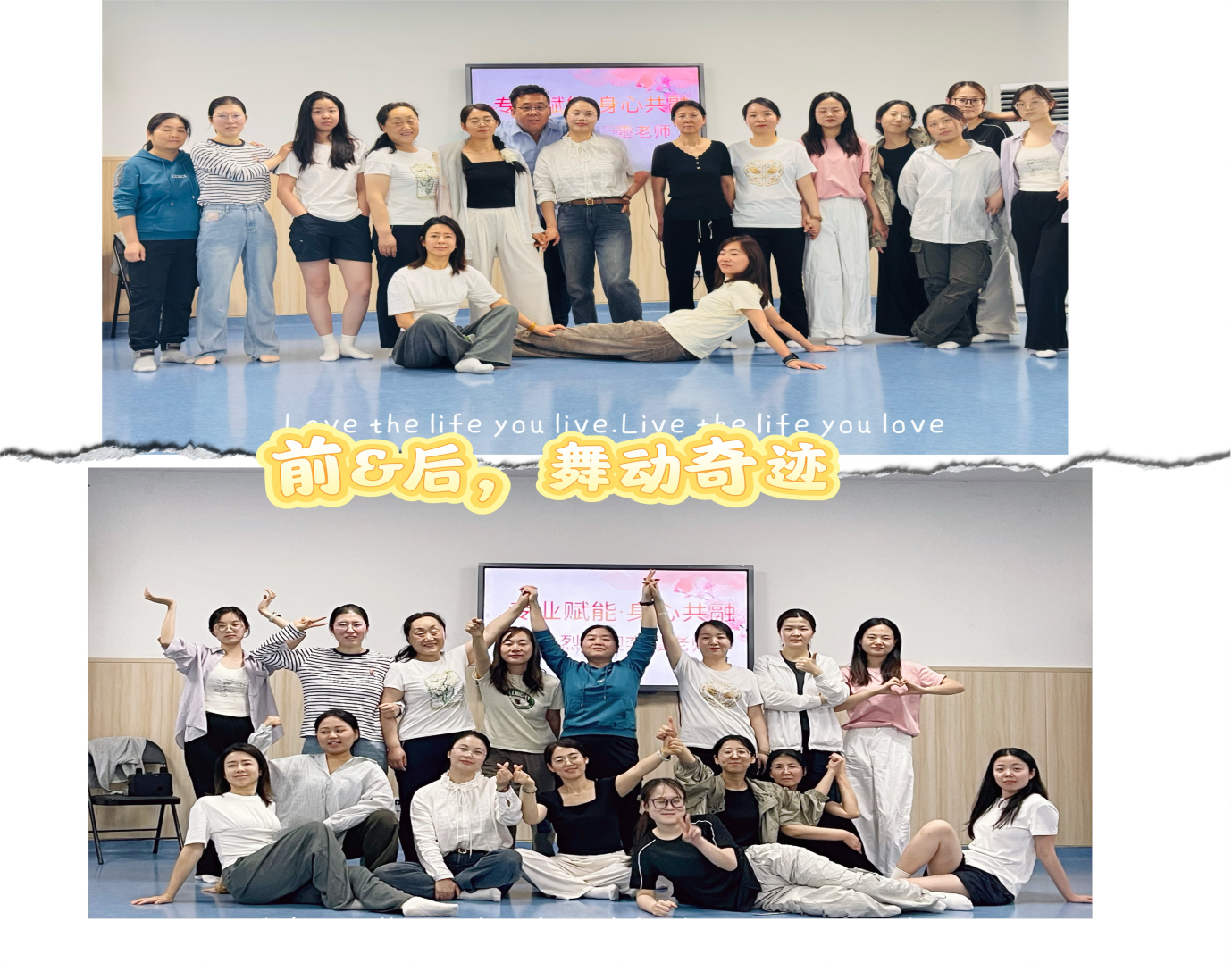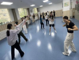 简短的理论讲解、问题解答后,艾琳老师带领团体成员进入实践环节。通过呼吸放松、动作创编、角色互动、镜像技术等环节,引导参与者探索自我、拓展心理边界,从不同的维度看到自己,释放自己,感受身体、情绪、场景的变化。参与者跟随老师的引导语逐渐融入团体。大家从最开始的拘谨到愉悦再到开心快乐,用肢体语言建立共情联结,在非语言互动中感受情感共鸣的力量。在舞动中放飞自我,释放压力,舒缓情绪,找回自我。