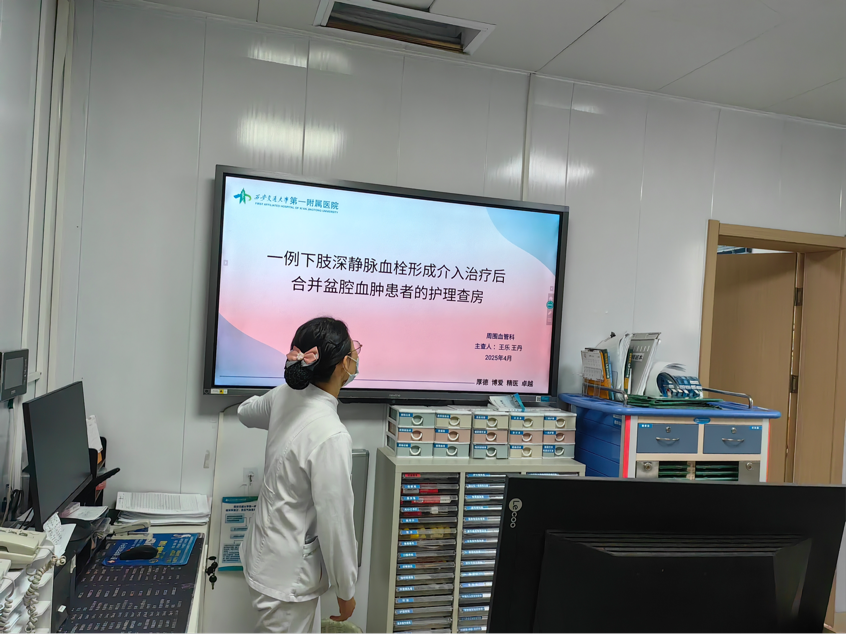 为进一步提升护理质量,强化团队应急处理及协作能力,西安交大一附院周围血管科于4月27日上午进行了典型案例护理查房,题目为《一例下肢深静脉血栓介入治疗后合并盆腔血肿患者的护理查房》,由王颖护士长王颖进行主持。主管护理师王乐和护理师王丹作为本次查房的主查人,以PPT形式进行精彩汇报分享,全体护士积极参与其中。查房以“患者为中心 质量为核心”为主题,通过病例汇报、护理计划、问题讨论以及盆腔血肿相关知识展开查房内容。