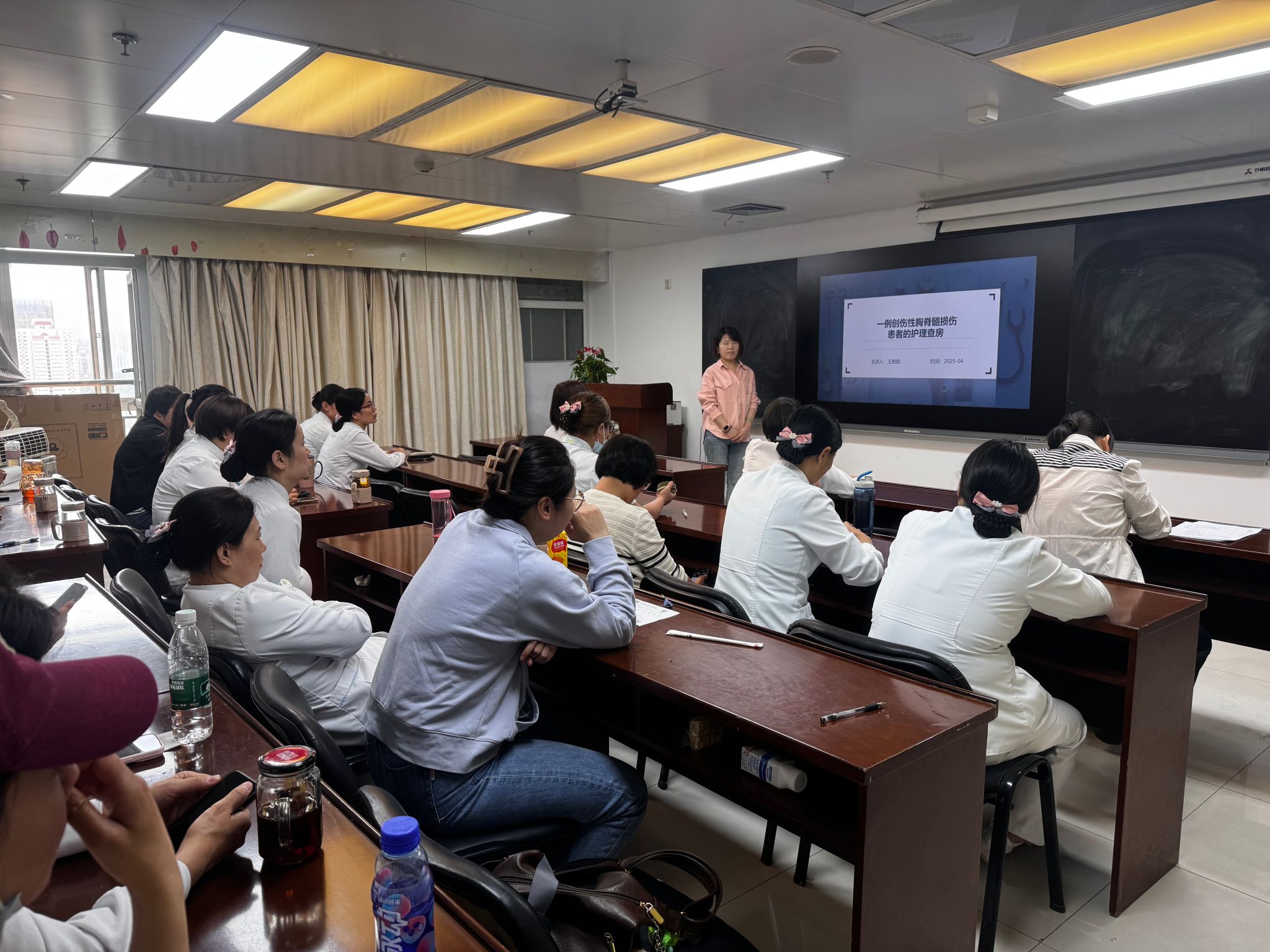 紧接着,王艳妮主管护理师又分享了一例创伤性胸脊髓损伤患者的护理查房,我们在巩固脊髓损伤患者护理要点的同时,更深入学习了胸脊髓损伤患者全周期的护理,优化了康复锻炼时机与相关并发症的预防,促进患者神经功能恢复,提高生活自理能力,重建心理社会适应。