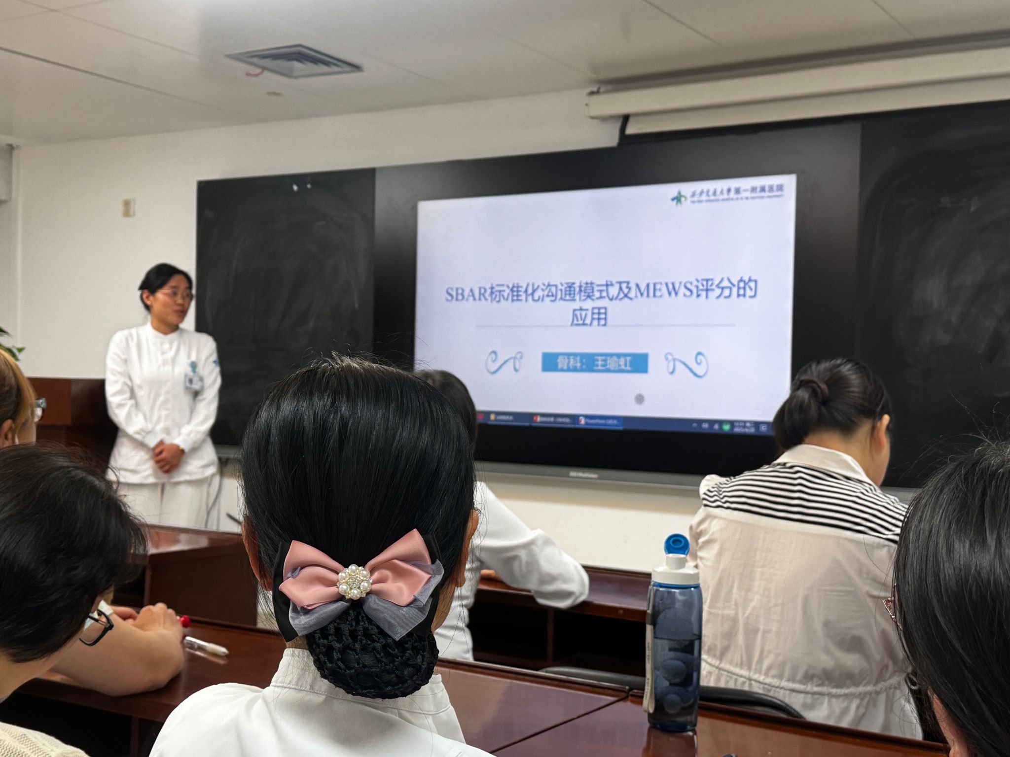 接下来,王瑜虹主管护理师通过案例模拟医护沟通场景,重点分享了SBAR标准化沟通模式,使大家更生动地体会到SBAR 沟通的意义并熟练运用于临床工作,同时也分享了MEWS 评分的相关内容及意义,使我们在工作中能够早期客观、科学地评价病情,识别潜在危重病人,保证患者的生命安全。
