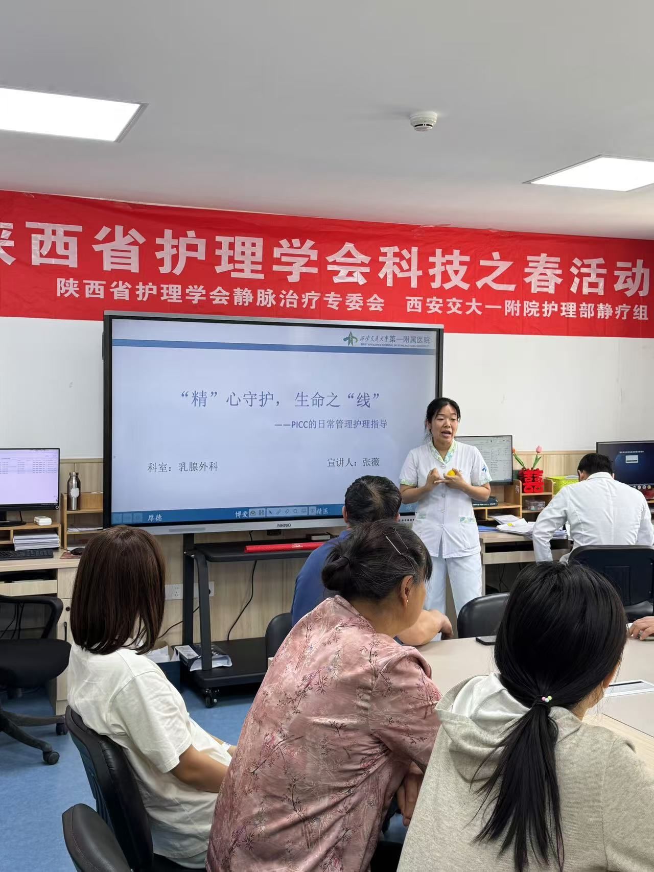 为响应陕西省科协、省护理学会第三十三届“科技之春”宣传月活动,4月29日下午,乳腺外科静疗专业组于南院区二楼医生办公室开展静疗科普宣传活动,聚焦提升患者及家属对中心静脉导管的认知与带管居家护理能力。
