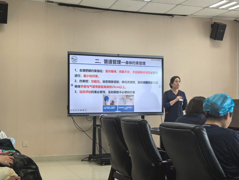 在会议的尾声,申存毅护士长围绕非计划拔管这一护理领域的热点问题,进行了深入浅出的讲解。她结合丰富的临床数据,详细阐述了非计划拔管的多方面原因及有效的预防策略,并从谵妄管理、身体约束管理、关注患者需求、健康指导四个关键方面,为气管插管患者的临床护理提供了细致入微的指导。她的分享不仅引发了大家的深刻思考,更为今后的护理工作指明了方向。