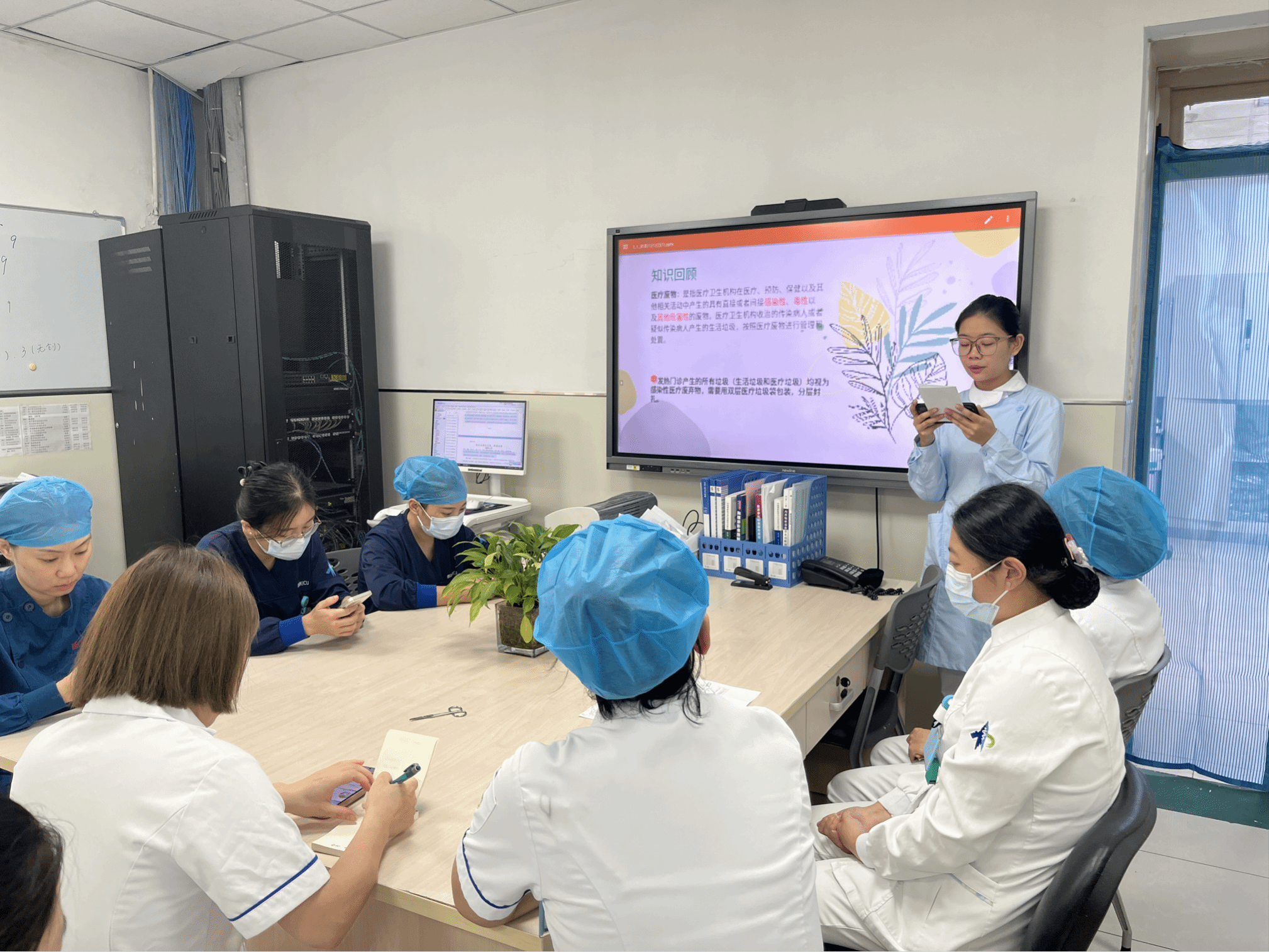 讨论环节,首先由高年资护士韩旭老师指出:各位同学第一次做查房,内容全面 声音洪亮总体表现非常好,但美中不足的是,实验室指标不全,护理问题不全面,病例不熟悉等主要问题,如果稍加修改 会呈现出更好的结果。总带教老师许娟老师指出:各位同学表现非常棒,但是缺乏总结,针对疾病本身要有重点的讲,护理问题要针对患者本人,因患者自身而提出,并非一味套用模板,将临床经验转化为可复制的护理要点。希望在各位老师的指点下,各位实习同学下一次可以做出更加优秀的护理查房,成为更优秀的护理人。