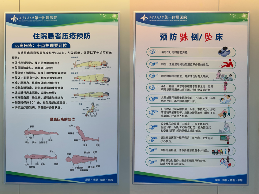 最后,所有的关怀与指导都汇聚于此,化为最切实的“安全守护”。这是健康长廊的终点,也是患者每日康复生活的安全起点。通过图文并茂的展板集中宣传“防跌倒措施”、“导管防脱指南”、“远离压疮十要点”等护理知识,将安全守护落实到最后一步。
