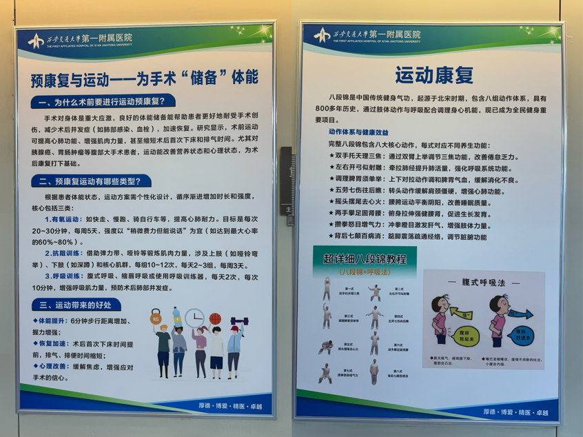 在长廊中段图文展示预康复与“运动”,为手术储备体能。核心指导患者依据自身体能状态,遵循“早活动、渐进式”原则,从术前的有氧运动、呼吸锻炼到术后踝泵运动、下床活动,科学唤醒身体机能,加速恢复。