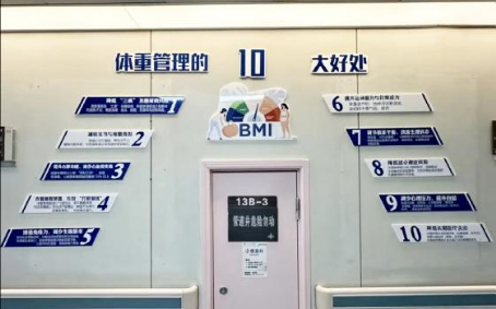 在病房走廊的醒目位置,“体重管理的十大好处”文化墙以极具设计感的呈现方式成为视觉焦点。蓝白相间的板块错落排布,数字“10”格外醒目,从“降低‘三高’及糖尿病风险”“减轻关节与骨骼负担”到“降低长期医疗支出”,每一条都以简洁明了的文字搭配专业解读,将体重管理对健康的多重益处清晰呈现。