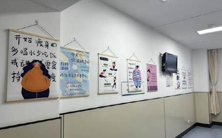 减重治疗不仅是生理上的干预,更需要心理上的支撑。为帮助高体重患者缓解住院期间的焦虑情绪,坚定减重信念,科室减重团队精心策划了病房布置工作。医护人员结合减重治疗特点,挑选了十余幅主题挂画,涵盖“科学饮食搭配”“术后康复要点”“循序渐进减重技巧”等核心内容,既用通俗的文字拆解专业医学知识,又以柔和的色彩、励志的画面传递积极信号,让健康减重理念融入日常。