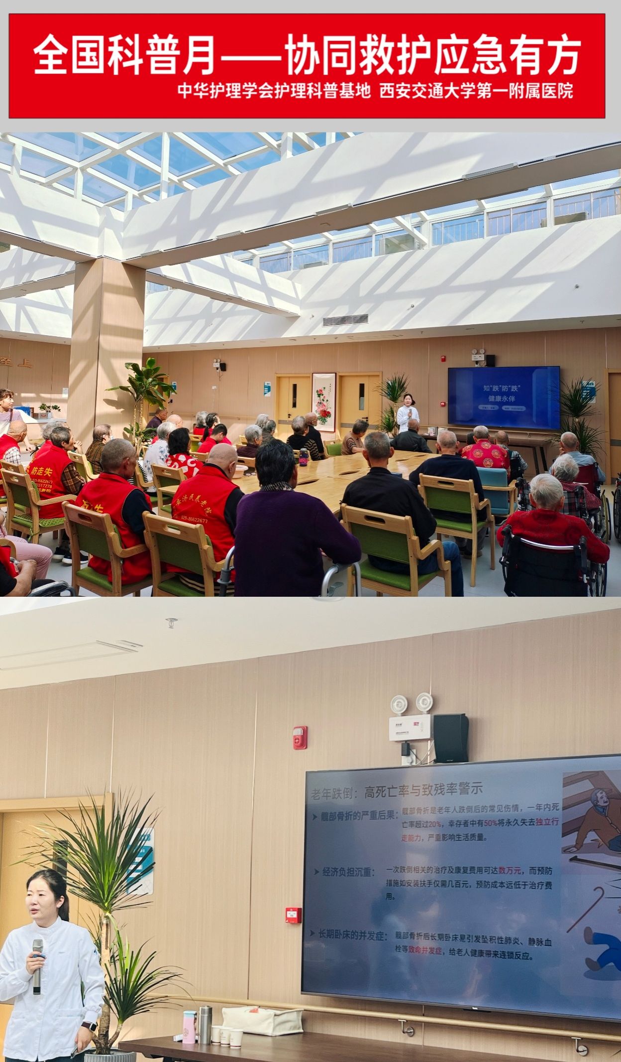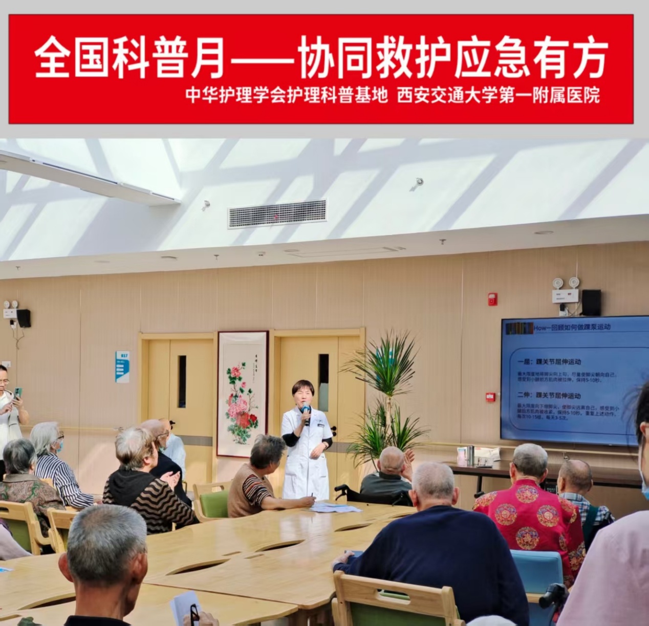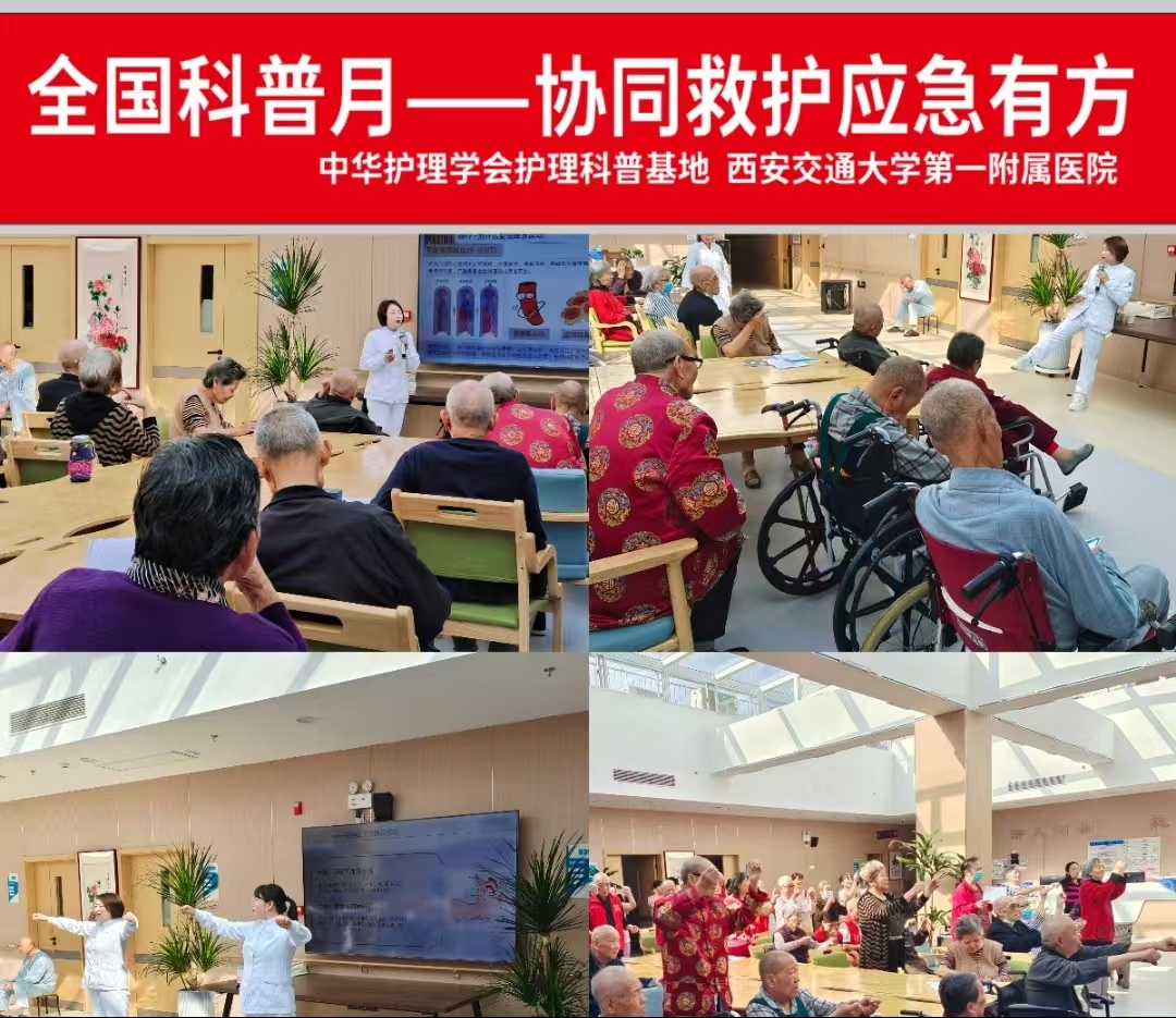 金秋送健康,科普暖夕阳。时值以“协同救护 应急有方”为主题的全国科普月,在陕西省医学传播学会、陕西省医学传播协会肿瘤专业委员会、西安市研究型医院学会安宁疗护专业委员会的大力支持下,中华护理学会护理科普基地西安交通大学第一附属医院肿瘤放疗科护理团队积极响应号召,在科室张晓智主任、李茸护士长的领导下积极组织科室健康科普宣讲团队走出院门,将专业、实用的健康知识送至银龄老人身边。9月20日,该科室健康科普宣讲团队走进西安市济民医养结合养老院,为那里的老人们带来了一场内容丰富、形式生动的健康科普讲座,受到了老人们的热烈欢迎和一致好评。