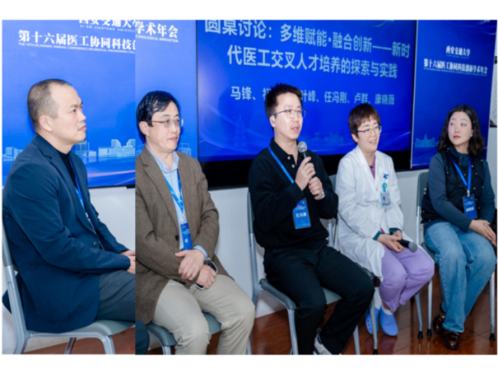 圆桌会议环节由医院教学部部长李雁主持,聚焦“新时代医工交叉人才培养的探索与实践”这一主题,邀请消化科初大可副主任、感控科叶峰主任、青年工作部任冯刚部长、临床技能培训中心卢群主任和康晓薇副主任等五位专家交流探讨。各位专家结合自身实践,就如何依托交大“强工科+大医科”平台优势,以临床问题为牵引,通过组建交叉团队,破解临床难题,培养复合型人才并推动医疗创新并形成产品,实现科教一体、产教融合一一分享经验。专家们的真知灼见引发师生深入思考,现场气氛热烈。