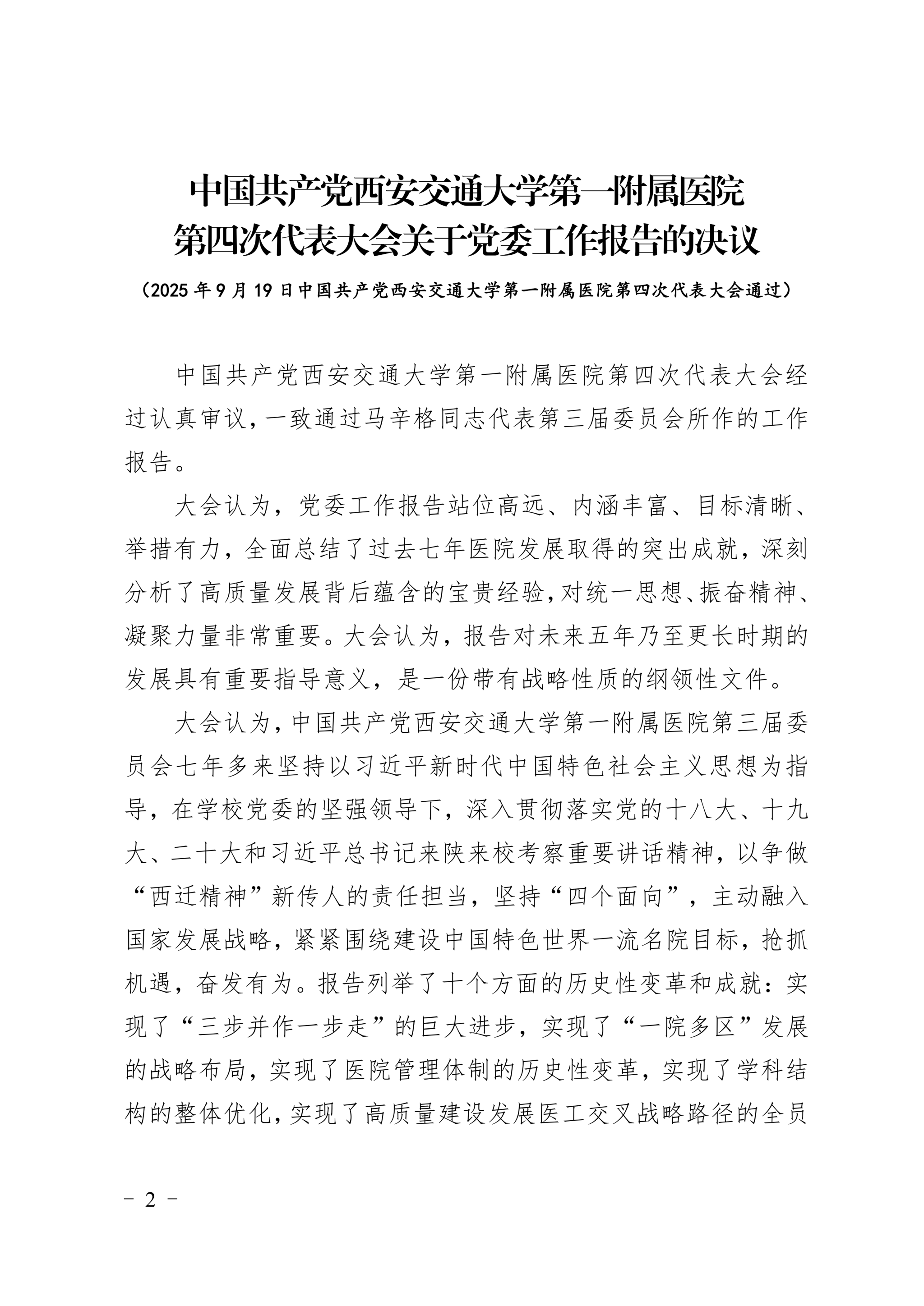 中国共产党西安交通大学第一附属医院第四次代表大会关于党委工作报告的决议