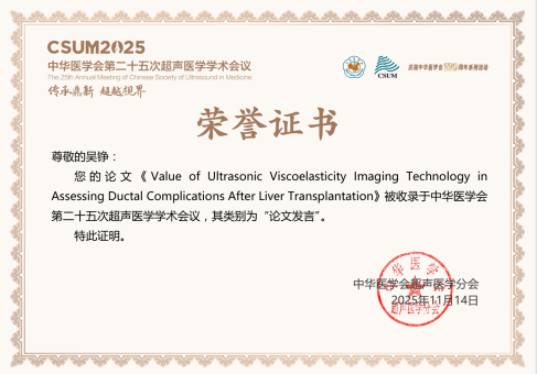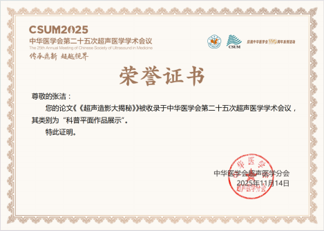 2025年11月13日至11月16日由中华医学会、中华医学会超声分会举办的“中华医学会第二十五次超声医学学术会议”在浙江省杭州市隆重召开。我院超声医学科硕士研究生吴铮、张洁受邀参加此次会议。会议期间吴铮作为优秀论文代表进行发言,张洁的科普海报被选作优秀科普作品展示。