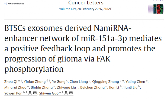 2025年12月9日,我院神经外科郭世文教授团队联合合作单位,在肿瘤学研究领域国际知名高水平学术期刊 《Cancer Letters》(中科院 1 区,JCR 分区 Q1,影响因子 10.1)上发表原创研究论文 “BTSCs exosomes derived NamiRNA-enhancer network of miR-151a-3p mediates a positive feedback loop and promotes the progression of glioma via FAK phosphorylation”(中文题目:脑肿瘤干细胞外泌体衍生的核 miR-151a-3p 增强子网络介导正反馈回路并通过 FAK 磷酸化促进胶质瘤进展)。该研究系统揭示了缺氧脑肿瘤干细胞通过外泌体传递“核激活 microRNA”,驱动胶质瘤进展的全新分子机制,并进一步验证了潜在靶向药物的治疗作用,为胶质瘤的精准干预提供了新的理论依据。