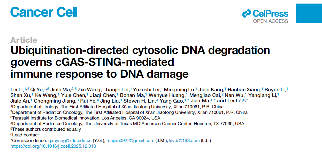 近日,西安交通大学第一附属医院李磊、马坚、高杨团队在国际肿瘤学顶级期刊《癌细胞》(Cancer Cell )上发表了题为 “Ubiquitination-directed cytosolic DNA degradation governs cGAS-STING-mediated immune response to DNA damage” 的研究论文。该研究聚焦放疗联合免疫治疗临床效果不佳这一关键问题,揭示了肿瘤细胞对放疗诱导免疫激活的内在调控方式,为理解部分患者对放射免疫治疗不敏感提供了重要依据以及新的治疗策略。