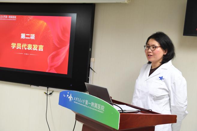 来自我院公共卫生中心的惠媛作为学员代表发言,她表态要珍惜此次难得的机会,进一步端正学习态度,营造良好氛围,巩固理论基础,锻炼科研思维,提升临床能力,争取早日达标。