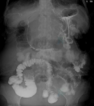 术后第二天胃肠道泛影葡胺造影显示支架通畅,造影剂沿支架流入小肠,小肠显影充分
