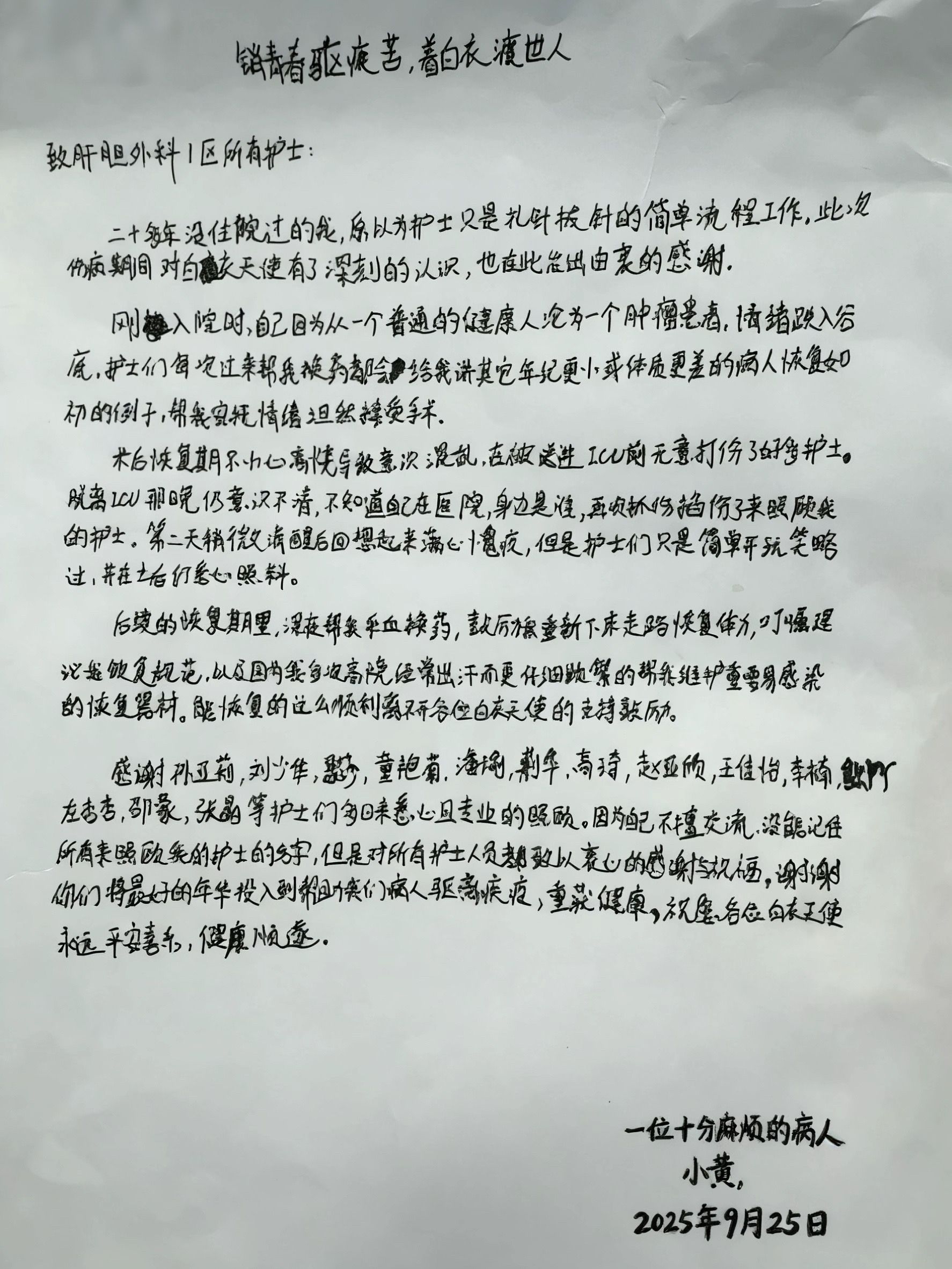 小黄在信中,特别感谢了肝胆一区孙亚利护士长、刘少华、董艳菊、李楠等多位护士每日悉心且专业的照顾,虽未能尽记所有护理人员姓名,却对全体护士满含感恩,赞其以美好年华践行“驱疾愈人”的使命。