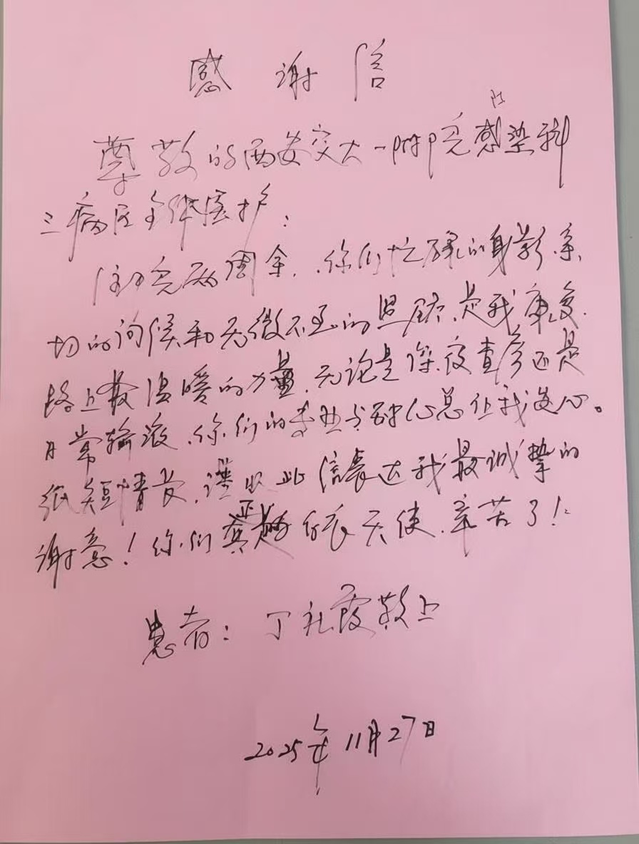 “你们忙碌的身影、亲切的问候和无微不至的照顾,是我康复路上最温暖的力量”——11月27日,西安交大一附院感染科三病区的医护人员,收到了患者丁阿姨递来的粉色感谢信。而这封带着温度的信背后,藏着一段从“不信任”到“托付真心”的病房故事。