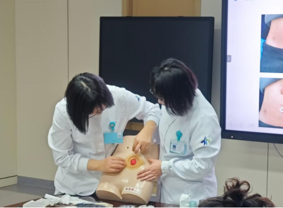 随后,王惠君副护士长围绕“造口周围皮肤问题的处理”展开专题讲解。她从造口用品的选择与更换、周围皮肤的清洁与保护、日常饮食与活动指导等方面,进行了详细演示和说明。通过生动的案例和直观的图片,她特别指出了居家护理中容易被忽视的细节,如底盘剪裁技巧、造口袋排空方法等,陈妮主管护师、陈梦云护师共同为大家进行造口护理操作流程现场演示,将每一个细小的注意事项都耐心地讲给大家,令患者和家属们受益匪浅。