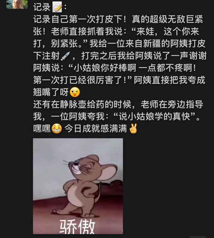 这些日子里,在老师们的悉心指导下,我逐渐掌握了管路安装、在线预冲和排气这些操作,也学会了在仪器报警时保持沉着冷静。更重要的是,我真正明白了“细心”该如何化为一个个具体的动作:比如,看到他想坐起身却有些吃力,我会立刻上前轻声询问:“需不需要帮您摇下床?”;在我第一次完成皮下注射后,阿姨微笑着对我说:“谢谢你,小姑娘,打的一点都不疼。”那句温暖的话,至今仍像一束光,照亮着我前行的路。
