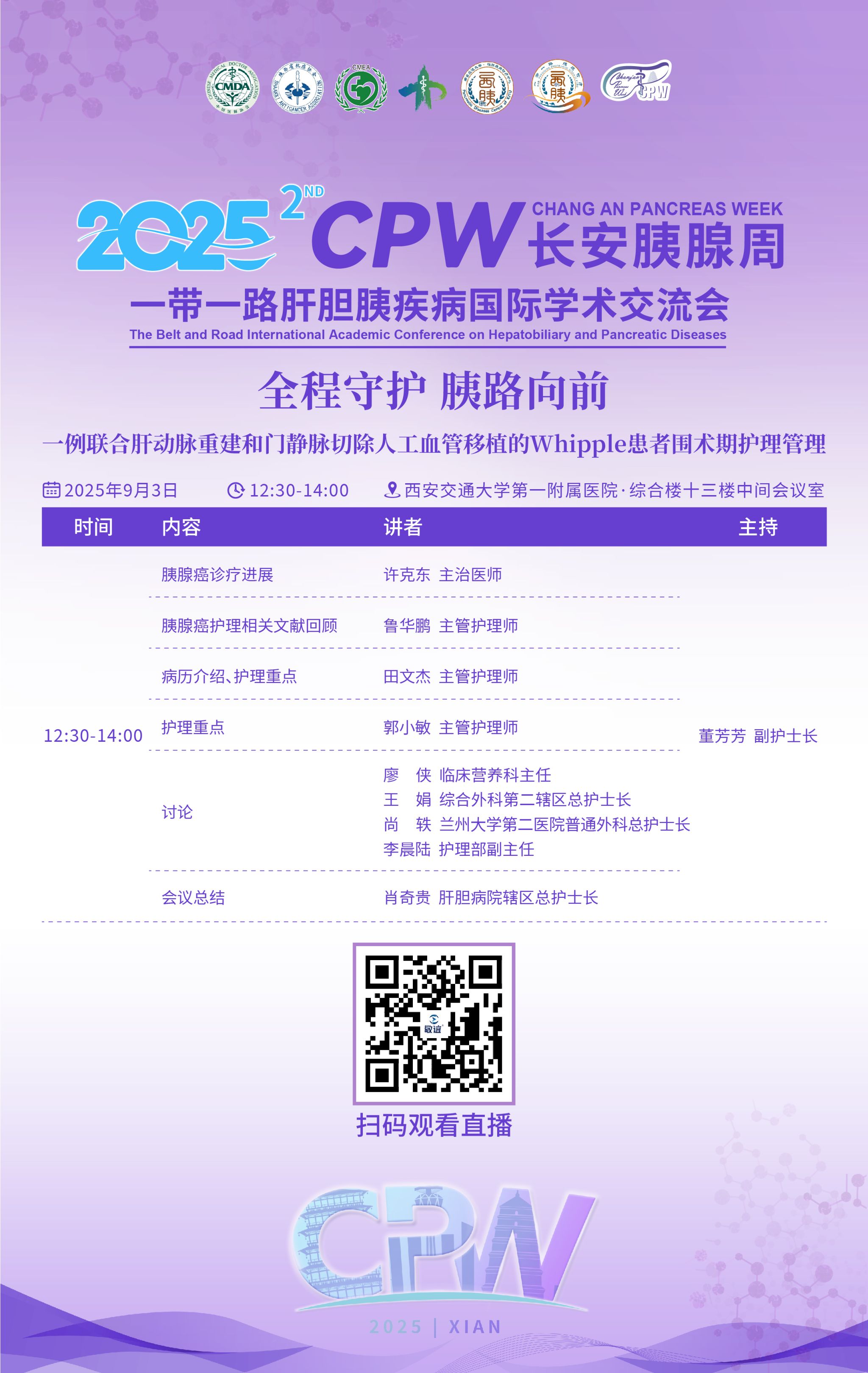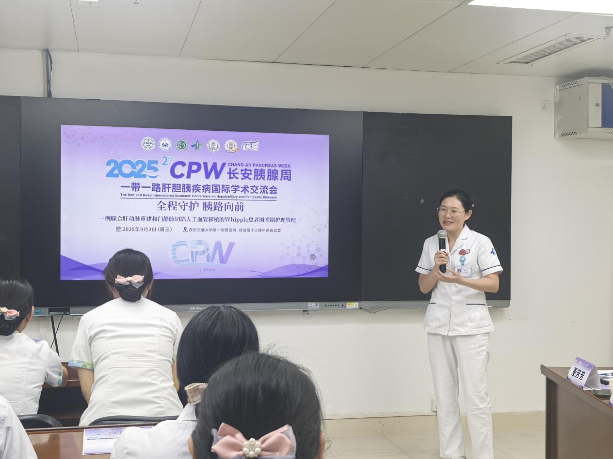 2025年9月3日中午,2025年第二届长安胰腺周“一带一路”肝胆胰疾病国际学术交流会系列活动之一《聚焦血管重建Whipple术护理攻坚、共探围术期管理核心策略——胰腺外科复杂手术标准化护理实践与多学科协作直播研讨会》在西安交通大学第一附属医院综合楼十三楼会议室举办,聚焦“全程守护 胰路向前”主题,围绕一例联合肝动脉重建和门静脉切除人工血管移植的Whipple患者围术期护理管理展开深入探讨。会议由董芳芳副护士长主持,肝胆外科全体护理人员线下参与,同步线上平台直播7000余人参与。