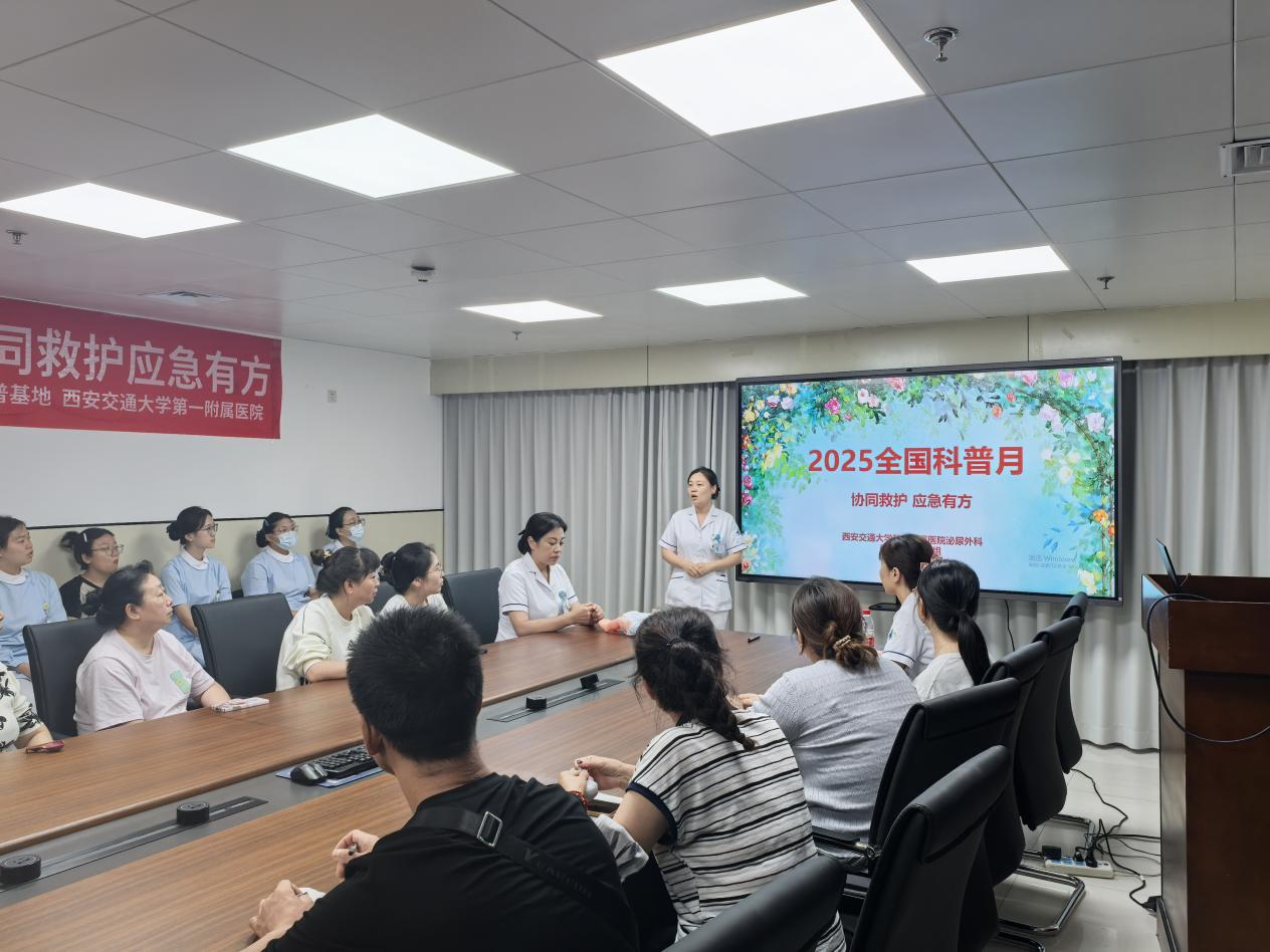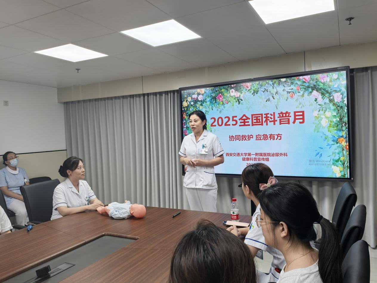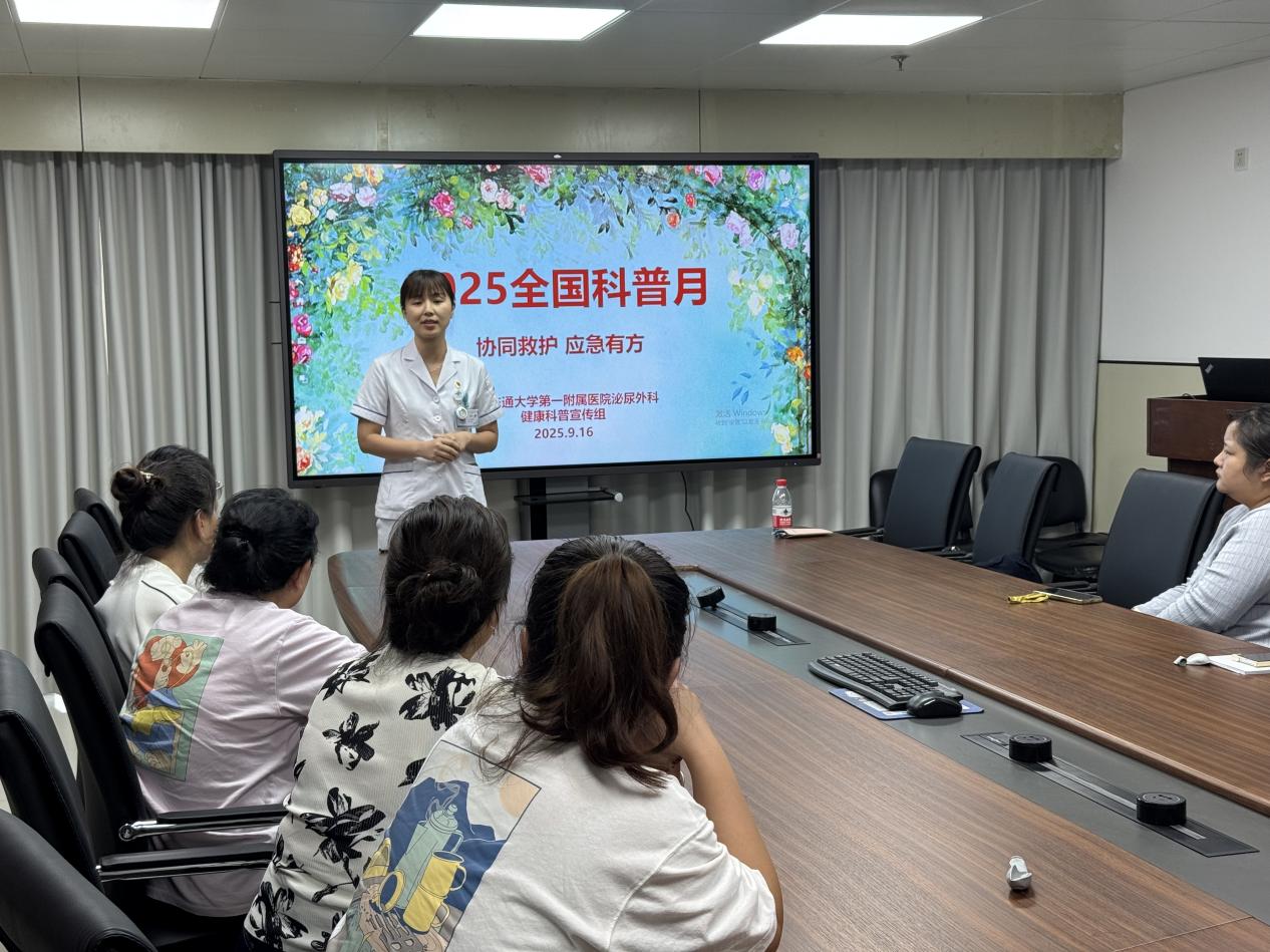 为积极响应全国科普宣传月的号召,深入贯彻落实“健康中国”战略,提升公众健康素养与自救互救能力,在护理部的统一领导和精心部署下,泌尿外科于9月16日下午15:00,在住院部16楼中间教室成功举办了一场以“协同救护,应急有方”为主题的健康宣讲活动。本次活动旨在通过专业、实用的急救知识与技能科普,构建更为和谐的医患协同救护体系,活动吸引了众多住院患者、家属以及部分院内职工的积极参与,现场学习氛围浓厚,反响热烈。