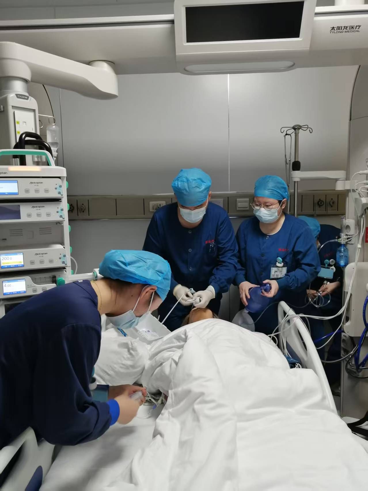 本次演练模拟一名64岁男性患者,因"脓毒症、肺炎感染"收入感染科重症监护室。当日12:35,监护仪突然报警,显示患者血压:112/73mmHg,心率:92次/分,呼吸6次/分,血氧饱和度:75%,责任护士给予氧气吸入6L/分,遵医嘱急查血气。12:40,患者意识丧失,血压:85/50mmHg,心率:51次/分,呼吸0次/分,血氧饱和度40%。责任护士立即启动应急响应,一场医护协作的生死救援迅速展开。