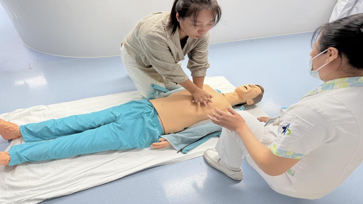 医护人员围绕心肺复苏的核心操作流程展开科普。从轻拍双肩判断患者意识、调整体位为仰卧位,到双手交叠定位按压点、保持30:2的按压与呼吸比例,每一个动作都严格遵循规范,每一个细节都讲解到位。“按压深度要达到5~6厘米,频率保持在每分钟100~120次”,护士一边演示,一边用通俗的语言拆解关键要点,确保在场人员能清晰理解操作核心。医护人员通过“理论讲解+现场演示”的方式,将专业的医学知识转化为通俗易懂的操作要点。为确保教学效果,现场设置了模拟人实操环节,医护人员一对一指导参与者进行练习,及时纠正按压姿势、力度等细节问题,帮助大家快速掌握操作要领,真正做到“听得懂、学得会、用得上”。