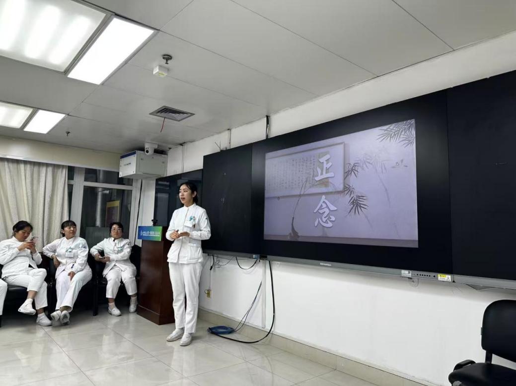 在经历了叙事护理的理性思考与情感共鸣后,活动进入了内在觉察的环节。李楠护士引导大家进行了正念训练。她强调,正念是一种精神训练,其核心在于有意识地觉察、将注意力集中于当下,以及对当下的一切观念都不作评判。她特别澄清,正念不同于“放空”或“逃避”,它强调清醒地面对现实,以觉察与接纳为工具实现内在自由。它并非追求“永远平静”,而是通过觉察与接纳,在纷扰中保持内心的清晰与平衡。在温和的引导语中,与会者们逐渐放松身心,体验当下的宁静,深刻感受正念作为一种需要持续练习的生活方式,所带来的内在力量。