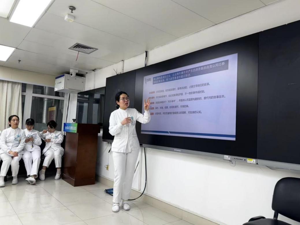 随后,赵梦护士带来了叙事护理的理论培训。她系统性地讲解了叙事护理的核心理念,并重点围绕外化、解构、改写、外部见证人、治疗文件这五大基本技术进行了深入浅出的阐述。为后续的案例分析与实践打下了坚实的理论基础,让大家认识到,倾听并重构患者的生命故事,本身就是一个强大的疗愈过程。