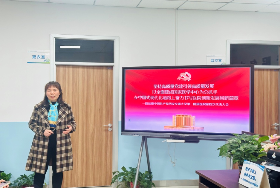 党支部蒋玉梅书记围绕第四次党代会的基本情况、核心内涵、重要意义展开了全面而深入的宣讲。她强调,随着党代会的胜利召开,学习宣传好、贯彻落实好第四次党代会精神,是医院当前及今后一个时期一项十分重要的政治任务,全体员工要深刻领会会议精神,汲取奋进力量,立足岗位与国家需要、医院未来发展、重点工作紧密结合,全力以赴建设国家医学中心,以青春之力助力强国建设、民族复兴伟业推向前进!