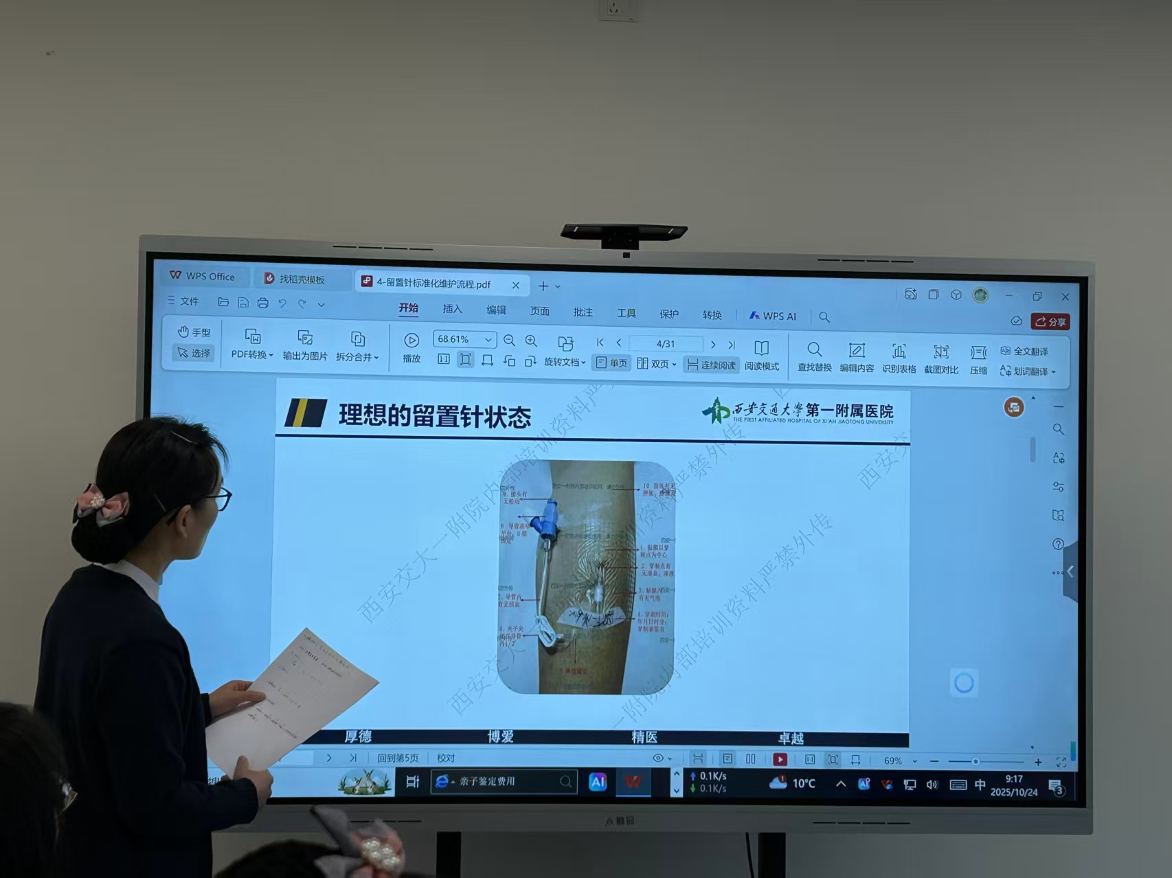 静脉治疗是临床护理的“生命线”,其质量直接关乎患者安全与康复。为全面贯彻最新静疗规范,提升护理质量,保障患者安全,10月30日09:15在陆港心内病区会议室贾娅琼护士长组织下,由院级静疗联络员周贻兰护理师进行留置针标准化维护流程培训。