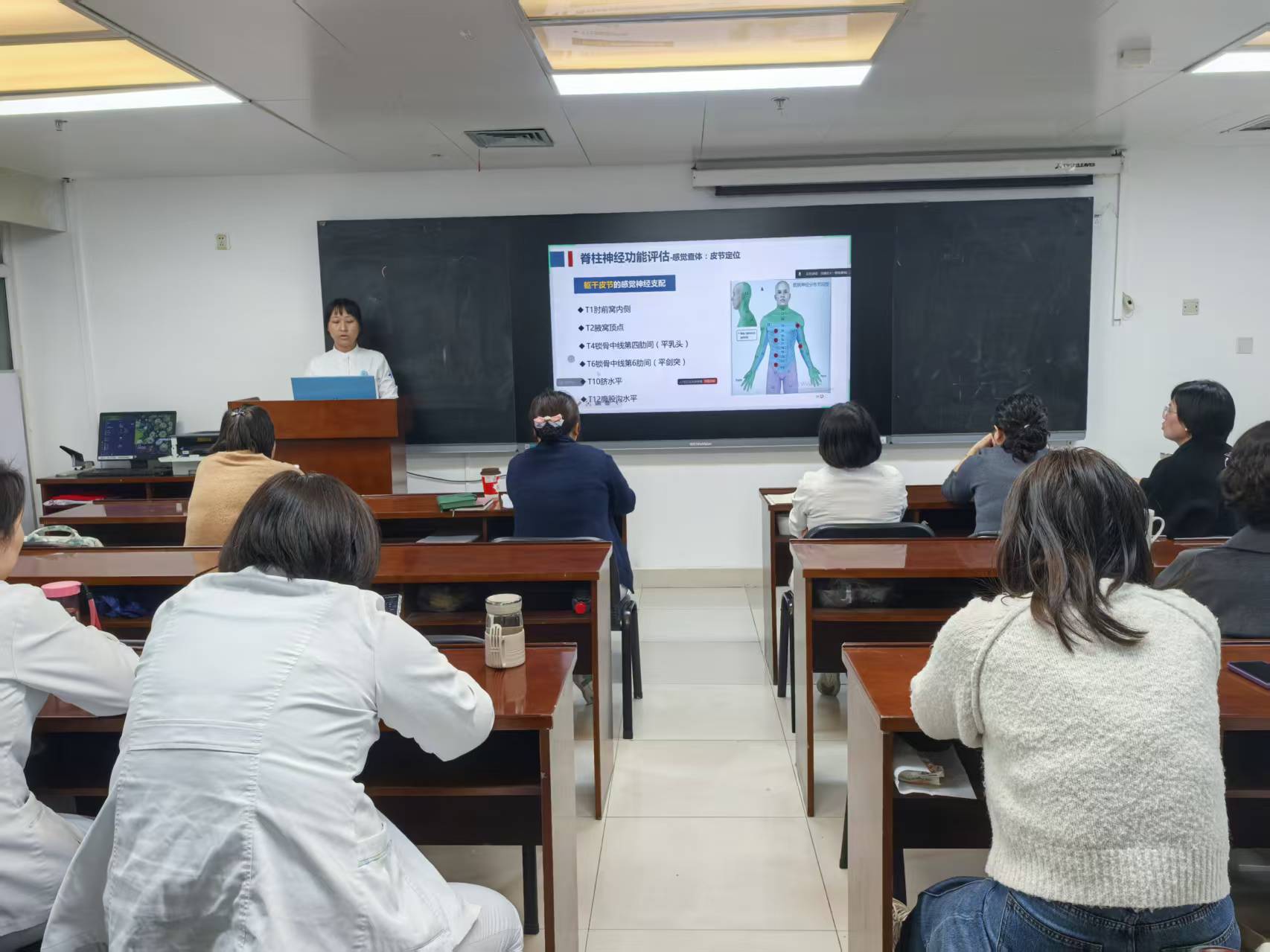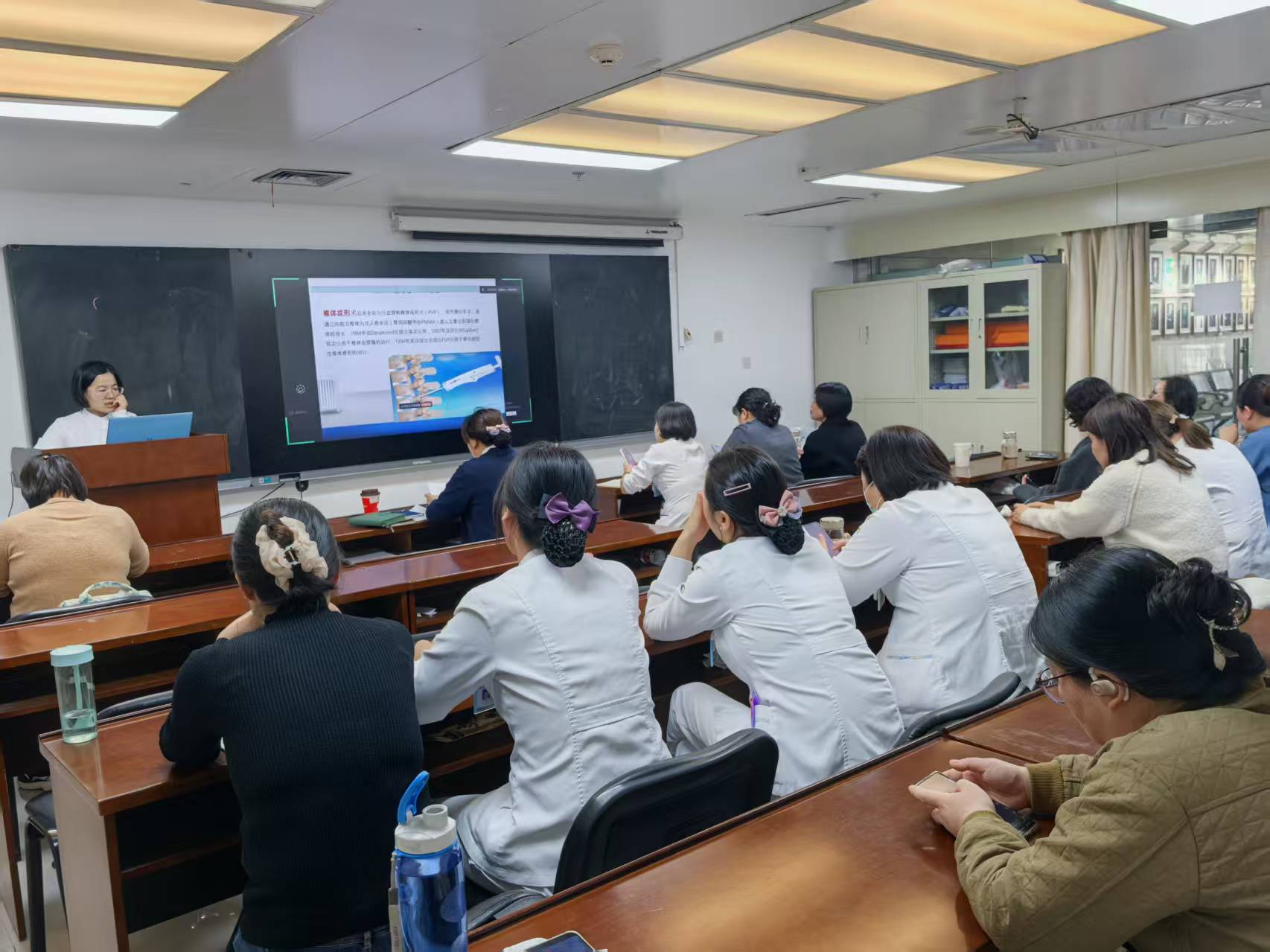 本次活动涵盖了理论学习、病例实践与质量管控等多个维度。在护理查房环节,由王赞主管护师围绕一例“胸12椎体压缩性骨折”的典型病例进行了深入汇报。查房重点聚焦于高龄椎体骨折患者如何更有效地进行围手术期护理这一核心议题。全体护士就此展开了热烈讨论,从术前风险评估、心理疏导、疼痛管理,到术后并发症预防、康复锻炼及营养支持等方面,分享了各自的经验与见解,为优化高龄骨折患者的护理路径提供了宝贵的临床思路。
