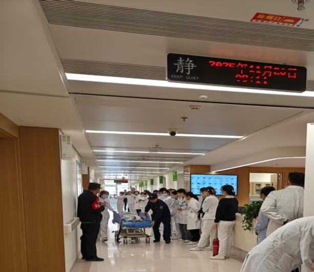 疏散引导组人员闻令而动、迅速就位,遵循“危重患者优先、专人全程护送、低姿弯腰前行”的原则,引导患者及家属用湿毛巾捂住口鼻,沿着疏散标识箭头方向,有序撤离至室外安全区域。对于卧床、行动不便的患者采用轮椅推送、平车转运等方式转移,全程密切兼顾患者病情监测与安全防护,尽显医者担当。通讯联络组同步向医院消防中控室及保卫科报告火情信息,清晰说明起火位置、火势大小及被困人员情况。整个演练过程衔接紧密、反应迅速,各小组分工明确、配合默契,充分展现了神经内科医护人员“临危不乱、科学处置、协同高效”的应急素养与专业风采。